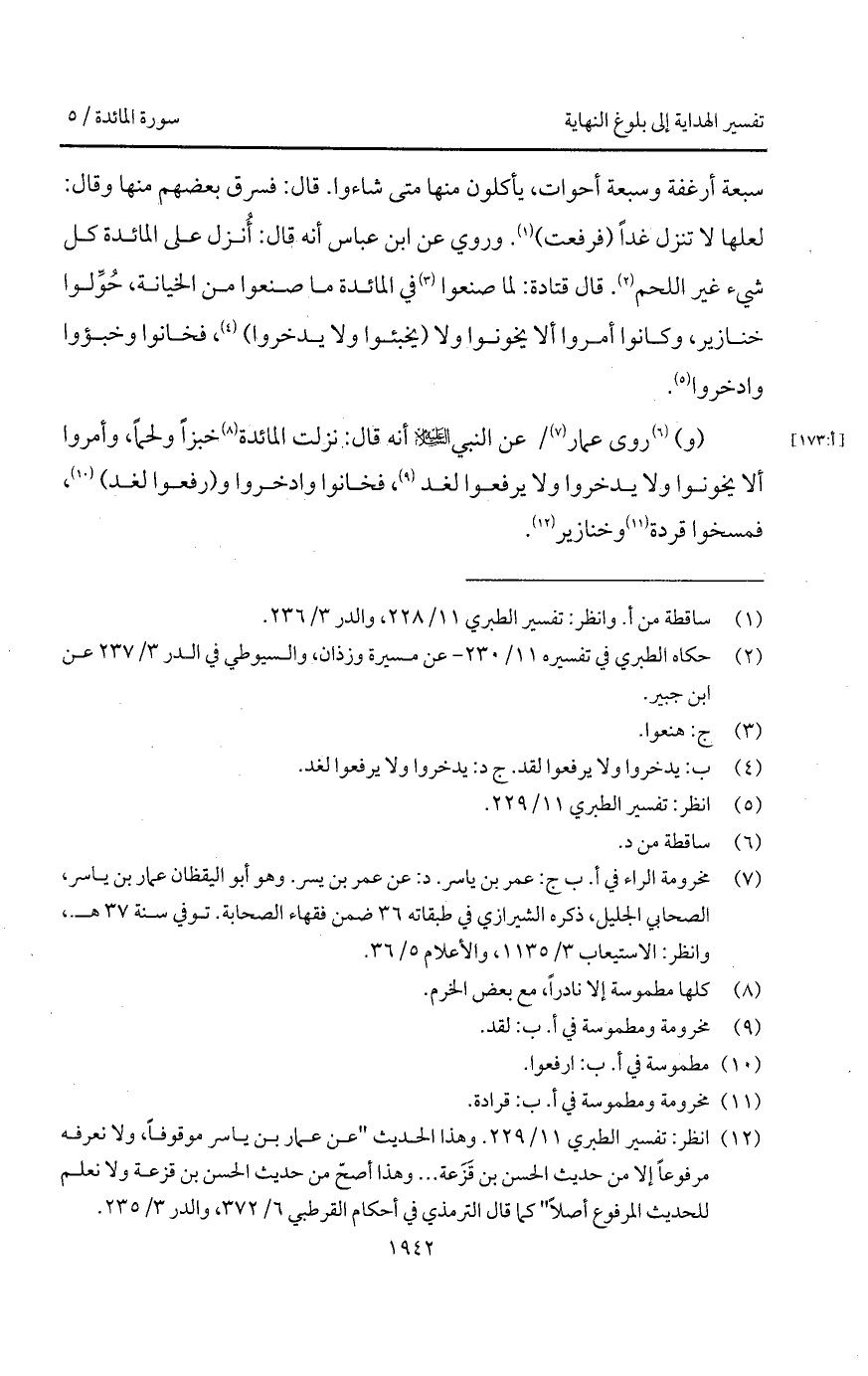 (و) روى عمار / عن النبي عليه السلام أنه قال: " نزلت المائدة خبزاً ولحماً، وأمروا ألا يخونوا ولا يدخروا ولا يرفعوا لغد، فخانوا وادخروا و (رفعوا لغد)، فمسخوا قردة وخنازير ".