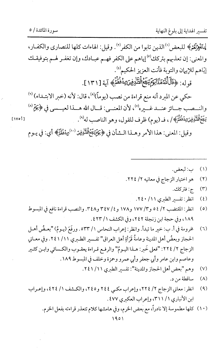حكي عن المبرد أنه منع قراءة من نصب (يوماً)، قال: لأنه (خبر الابتداء) والنصب جائز عند غيره، لأن المعنى: قال الله هذا لعيسى في {يَوْمُ يَنفَعُ الصادقين صِدْقُهُمْ} /، ف (يوم) ظرف للقول، وهو الناصب له.