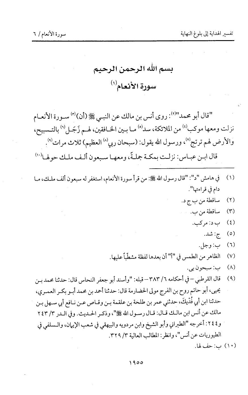 "قال أبو محمد": روى أنس بن مالك عن النبى - صلى الله عليه وسلم - (أن) سورة الأنعام نزلت ومعها موكب من الملائكة، سد ما بين الخافقيّن، لهم زَجَل بالتسبيح، والأرض لهم ترتج، ورسول الله يقول: (سبحان ربي العظيم) ثلاث مرات.