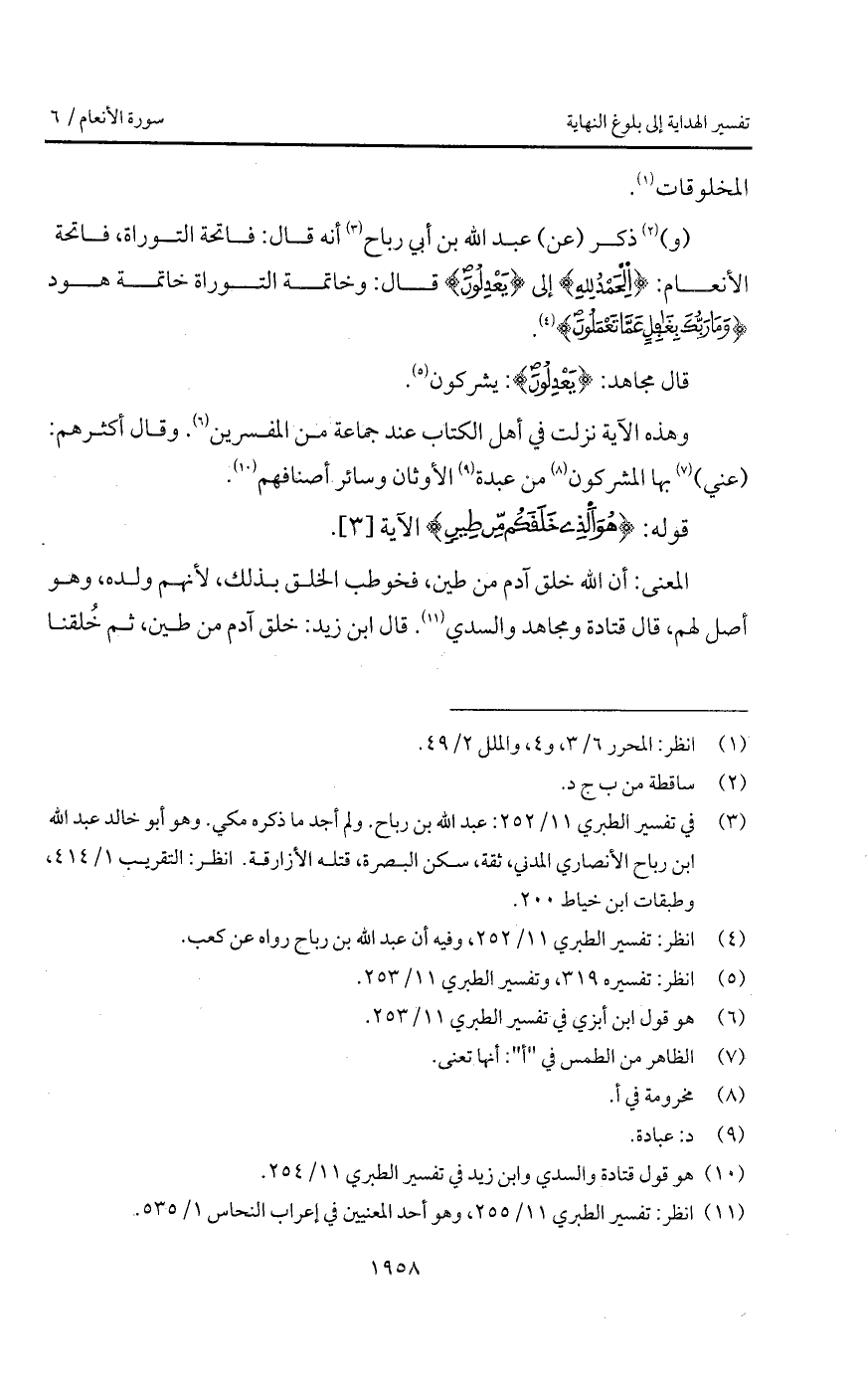 (و) ذكر (عن) عبد الله بن أبي رباح أنه قال: فاتحة التوراة، فاتحة الأنعام: {الحمد للَّهِ} إلى {يَعْدِلُونَ} قال: وخاتمة التوراة خاتمة هود {وَمَا رَبُّكَ بِغَافِلٍ عَمَّا تَعْمَلُونَ}.