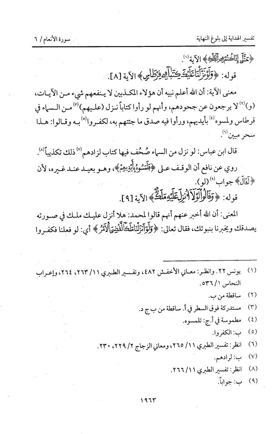 معنى الآية: أن الله أعلم نبيه أن هؤلاء المكذبين لا ينفعهم شيء من الآيات، (و) لا يرجعون عن جحودهم، وأنهم لو رأوا كتاباً نزل (عليهم) من السماء في قرطاس ولمسوه بأيديهم، ورأوا فيه صدق ما جئتهم به، لكفروا به وقالوا: هذا سحر مبين.
