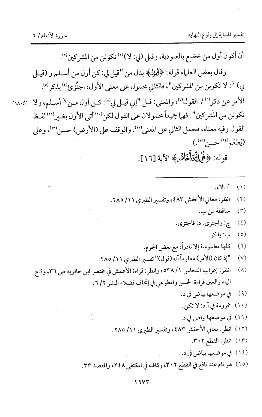 وقال بعض العلماء قوله: {أُمِرْتُ} بدل من " قيل لي: كن أول من أسلم و (قيل لي): لا تكونن من المشركين "، فالثاني محمول على معنى الأول، اجتُزئ بذكر. الأمر عن ذكر / القول، والمعنى: قل " إني قيل لي: كن أول من أسلم، ولا تكونن من المشركين ". فهما جميعاً محمولان على القول لكن أتى الأول بغير لفظ القول وفيه معناه، فحمل الثاني على المعنى. والوقف على (الأرض) حسن، وعلى (يُطعَم حسن.)