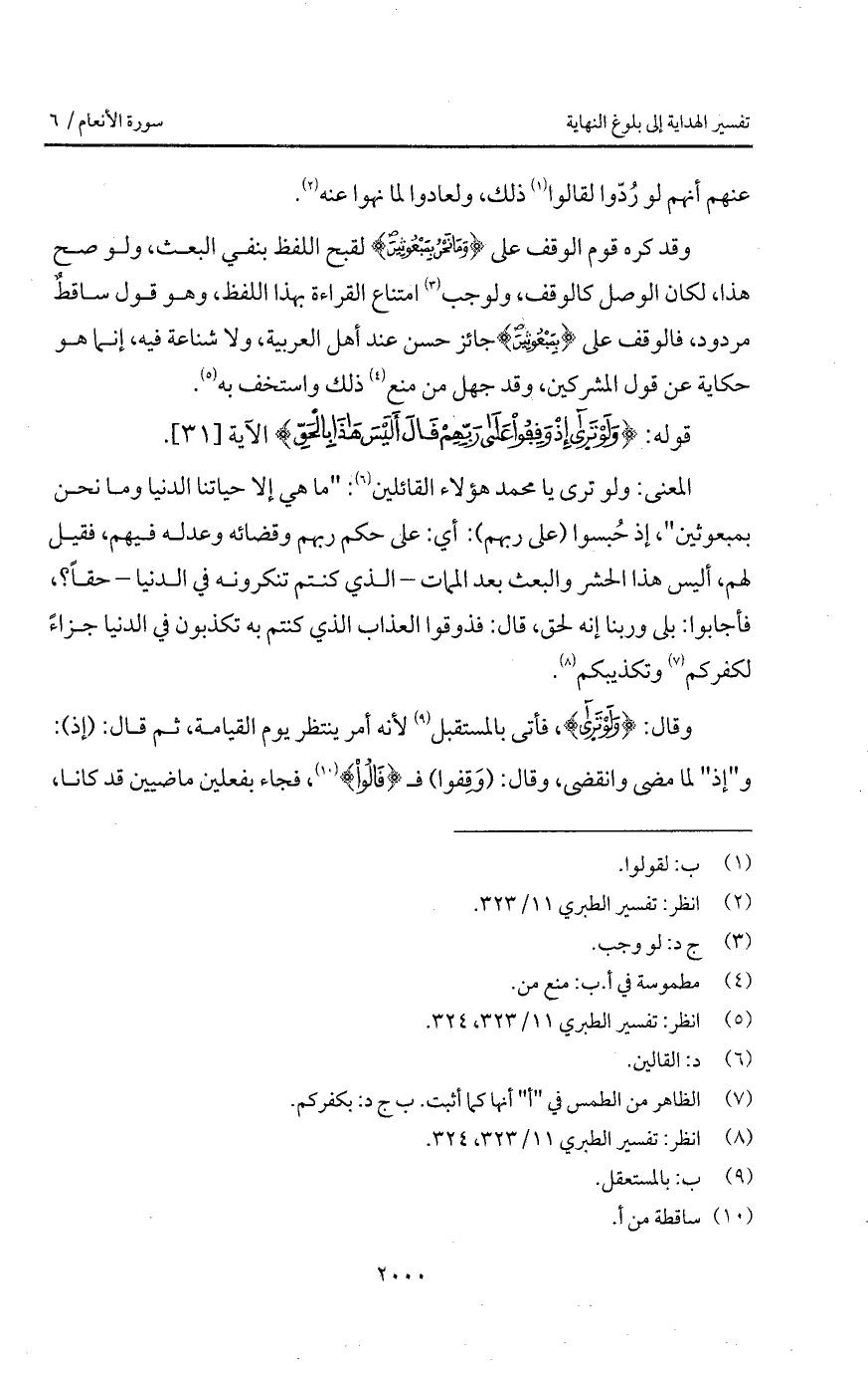المعنى: ولو ترى يا محمد هؤلاء القائلين: " ما هي إلا حياتنا الدنيا وما نحن بمبعوثين "، إذ حُبسوا (على ربهم): أي: على حكم ربهم وقضائه وعدله فيهم، فقيل لهم، أليس هذا الحشر والبعث بعد الممات - الذي كنتم تنكرونه في الدنيا - حقاً؟، فأجابوا: بلى وربنا إنه لحق، قال: فذوقوا العذاب الذي كنتم به تكذبون في الدنيا جزاءً لكفركم وتكذيبكم.