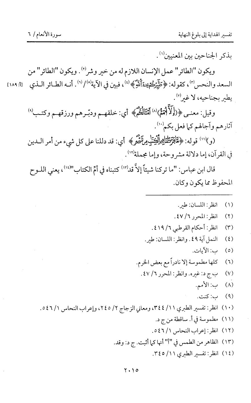 ويكون " الطائر " عمل الإنسان اللازم له من خير وشر، ويكون " الطائر " من السعد والنحس، كقوله: {طَائِرُكُمْ عِندَ الله} [النمل: 47]، فبين في الآية /. أنه الطائر الذي يطير بجناحيه، لا غير.