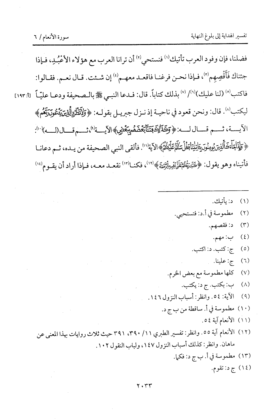 فضلنا، فإن وفود العرب تأتيك فنستحي أن ترانا العرب مع هؤلاء الأعْبُدِ، فإذا جئناك فَأَقْصِهِم، فإذا نحن فرغنا فاقعد معهم إن شئت. قال نعم. فقالوا: فاكتب (لنا عليك) / بذلك كتاباً. قال: فدعا النبي A بالصحيفة ودعا عليّاً ليكتب. قال: ونحن قعود في ناحية إذ نزل جبريل بقوله: {وَلاَ تَطْرُدِ الذين يَدْعُونَ رَبَّهُمْ} الآية، ثم قال له: {وكذلك فَتَنَّا بَعْضَهُمْ بِبَعْضٍ} [الأنعام: 53] الآية، ثم قال (له): {وَإِذَا جَآءَكَ الذين يُؤْمِنُونَ بِآيَاتِنَا فَقُلْ سلام عَلَيْكُمْ} [الأنعام: 54] الآية. فألقى النبي الصحيفة من يده، ثم دعانا فأتيناه وهو يقول: {كَتَبَ رَبُّكُمْ على نَفْسِهِ الرحمة} [الأنعام: 54]، فكنا نقعد معه، فإذا أراد أن يقوم