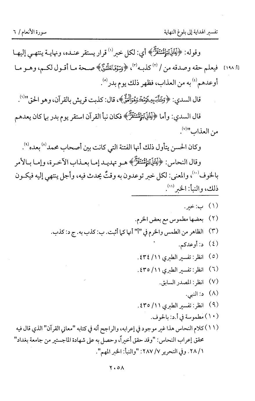 وقال النحاس: {لِّكُلِّ نَبَإٍ مُّسْتَقَرٌّ} هو تهديد إما بعذاب الآخرة، وإما بالأمر بالخوف، والمعنى: لكل خبر توعدون به وقتٌ يحدث فيه، وأجل ينتهي إليه فيكون ذلك، والنبأ: الخبر.
