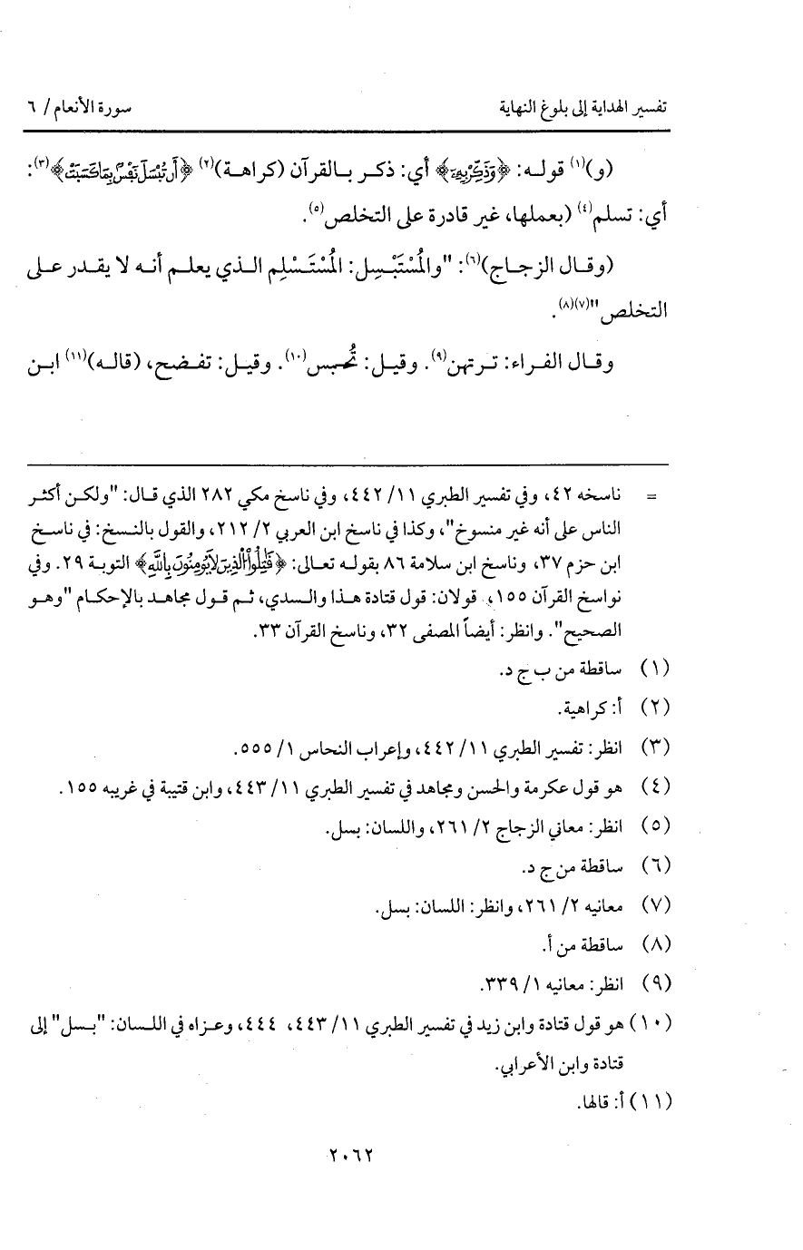 (و) قوله: {وَذَكِّرْ بِهِ} أي: ذكر بالقرآن (كراهة) {أَن تُبْسَلَ نَفْسٌ بِمَا كَسَبَتْ}: أي: تسلم (بعملها، غير قادرة على التخلص.
