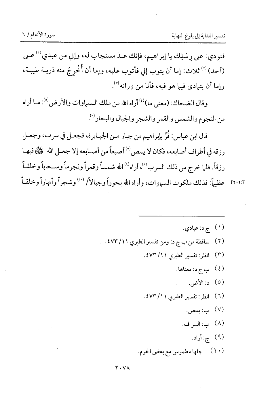 قال ابن عباس: فُرَّ بإبراهيم من جبار من الجبابرة، فجعل في سرب، وجعل رزقه في أطراف أصابعه، فكان لا يمص أصبعاً من أصابعه إلا جعل الله D فيها رزقاً. فلما خرج من ذلك السرب، أراه الله شمساً وقمراً ونجوماً وسحاباً وخلقاً عظيماً: فذلك ملكوت السماوات، وأراه الله بحوراً وجبالاً / وشجراً وأنهاراً وخلقاً