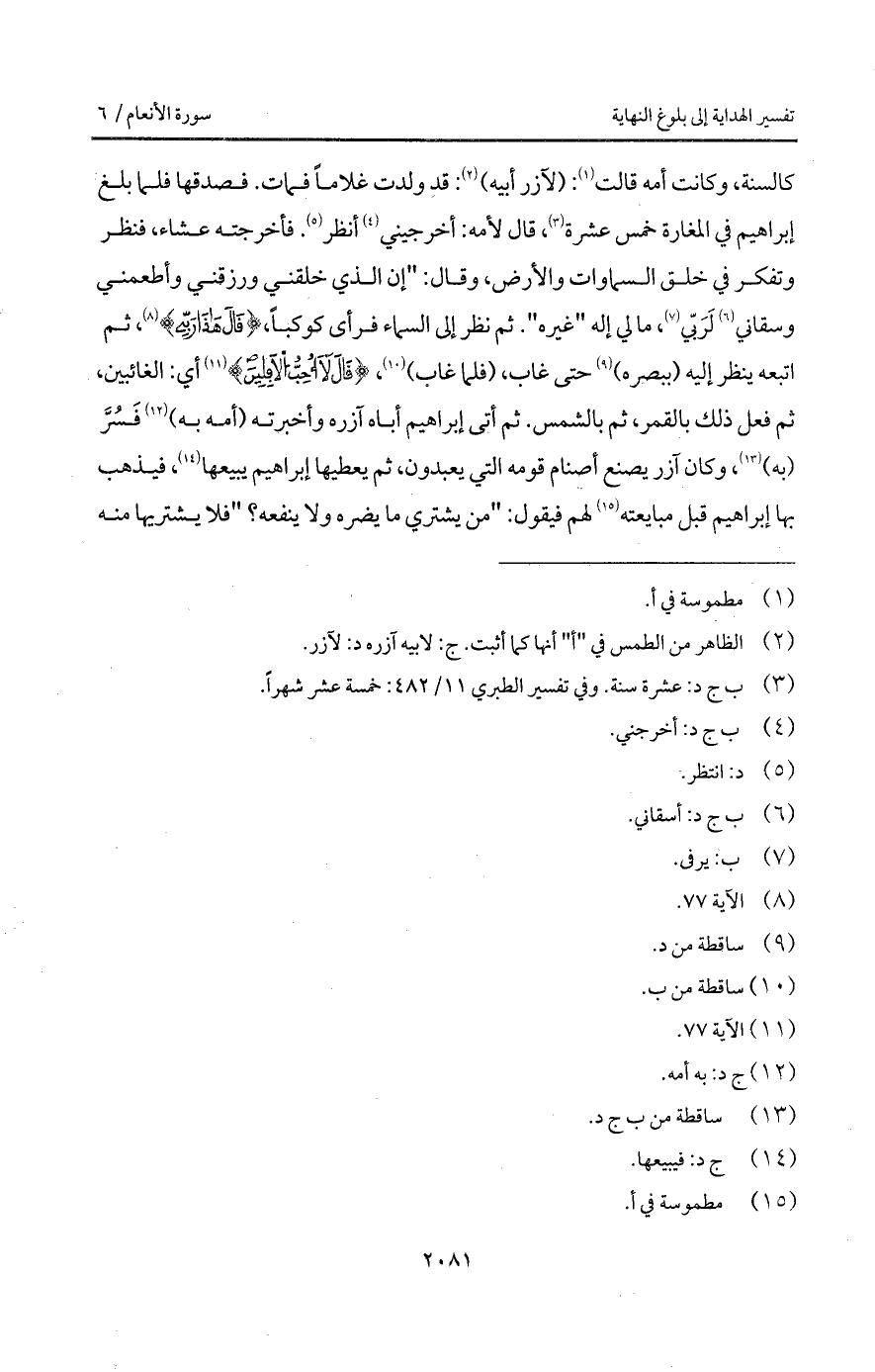كالسنة، وكانت أمه قالت: (لآزر أبيه): قد ولدت غلاماً فمات. فصدقها فلما بلغ إبراهيم في المغارة خمس عشرة، قال لأمه: أخرجيني أنظر. فأخرجته عشاء، فنظر وتفكر في خلق السماوات والأرض، وقال: " إن الذي خلقني ورزقني وأطعمني وسقاني لَرَبّي، ما لي إله " غيره ". ثم نظر إلى السماء فرأى كوكباً، {قَالَ هذا رَبِّي}، ثم اتبعه ينظر إليه (ببصره) حتى غاب، (فلما غاب)، {لا أُحِبُّ الآفلين} أي: الغائبين، ثم فعل ذلك بالقمر، ثم بالشمس. ثم أتى إبراهيم أباه آزره وأخبرته (أمه به) فَسُرَّ (به)، وكان آزر يصنع أصنام قومه التي يعبدون، ثم يعطيها إبراهيم يبيعها، فيذهب بها إبراهيم قبل مبايعته لهم فيقول: " من يشتري ما يضره ولا ينفعه؟ " فلا يشتريها منه