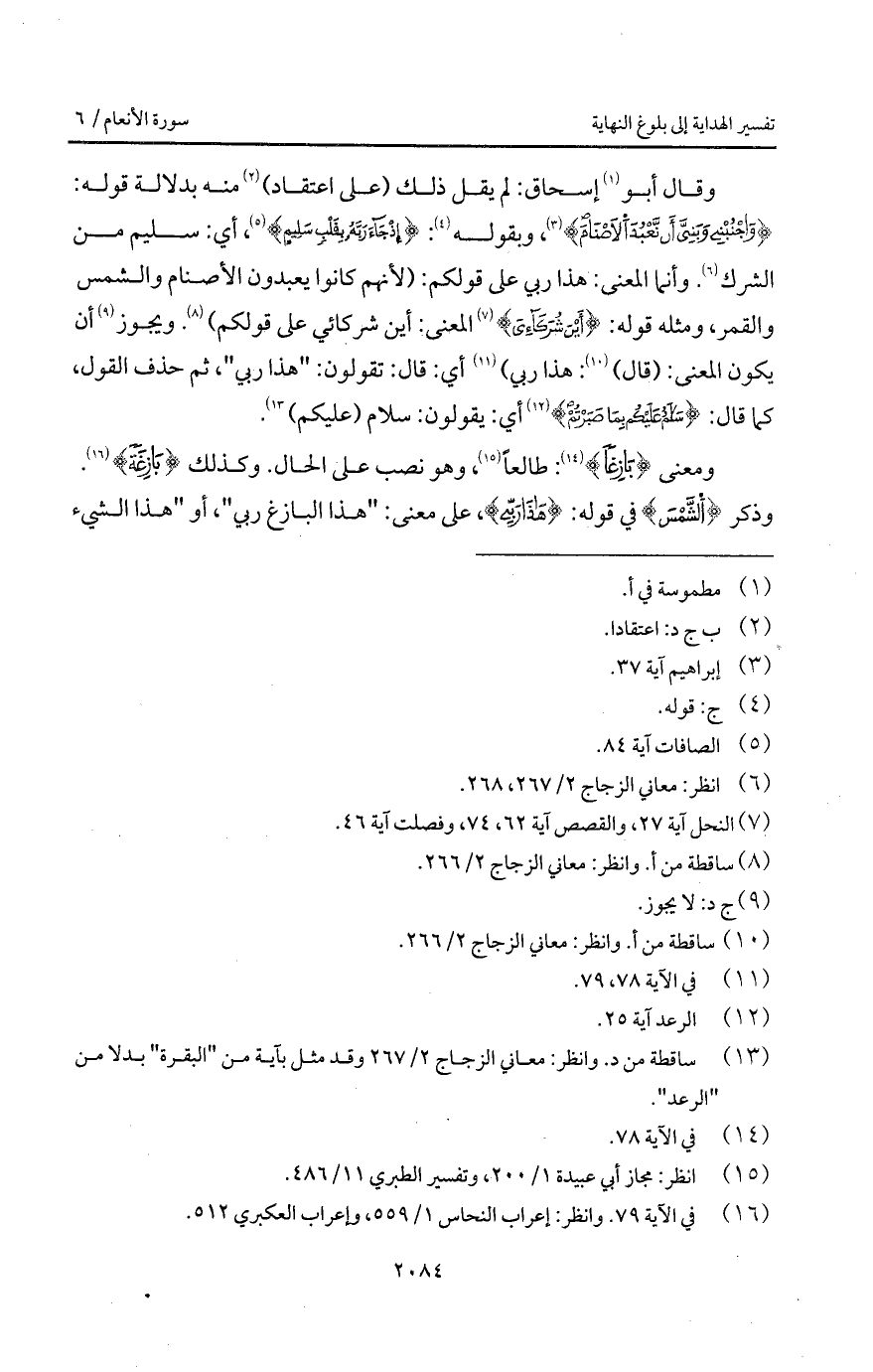 وقال أبو إسحاق: لم يقل ذلك (على اعتقاد) منه بدلالة قوله: {واجنبني وَبَنِيَّ أَن نَّعْبُدَ الأصنام} [إبراهيم: 35]، وبقوله: {إِذْ جَآءَ رَبَّهُ بِقَلْبٍ سَلِيمٍ} [الصافات: 84]، أي: سليم من الشرك. وأنما المعنى: هذا ربي على قولكم: (لأنهم كانوا يعبدون الأصنام والشمس والقمر، ومثله قوله: {أَيْنَ شُرَكَآئِيَ} [النحل: 27، القصص: 62، 74، فصلت: 47] المعنى: أين شركائي على قولكم). ويجوز أن يكون المعنى: (قال): هذا ربي) أي: قال: تقولون: " هذا ربي "، ثم حذف القول، كما قال: {سَلاَمٌ عَلَيْكُم بِمَا صَبَرْتُمْ} [الرعد: 24] أي: يقولون: سلام (عليكم).
