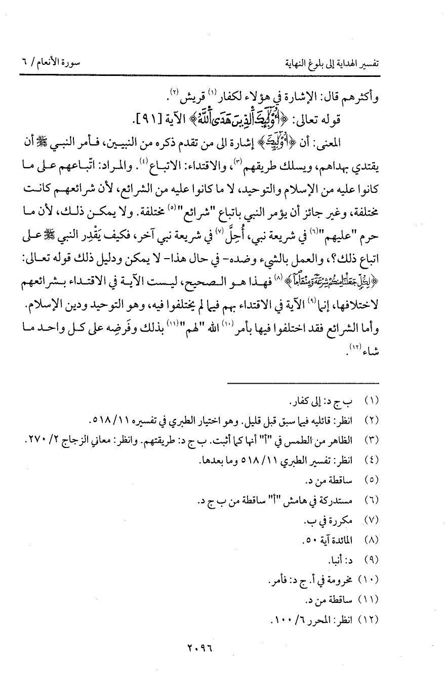 المعنى: أن {أولئك} إشارة إلى من تقدم ذكره من النبيين، فأمر النبي A أن يقتدي بهداهم، ويسلك طريقهم، والاقتداء: الاتباع. والمراد: اتّباعهم على ما كانوا عليه من الإسلام والتوحيد، لا ما كانوا عليه من الشرائع، لأن شرائعهم كانت مختلفة، وغير جائز أن يؤمر النبي باتباع " شرائع " مختلفة، ولا يمكن ذلك، لأن ما حرم " عليهم " في شريعة نبي، أُحِلَّ في شريعة نبي آخر، فكيف يَقْدِر النبي A على اتباع ذلك؟، والعمل بالشيء وضده - في حال هذا - لا يمكن ودليل ذلك قوله تعالى: {لِكُلٍّ جَعَلْنَا مِنكُمْ شِرْعَةً وَمِنْهَاجاً} [المائدة: 48] فهذا هو الصحيح، ليست الآية في الاقتداء بشرائعهم لاختلافها، إنما الآية في الاقتداء بهم فيما لم يختلفوا فيه، وهو التوحيد ودين الإسلام. وأما الشرائع فقد اختلفوا فيها بأمر الله " لهم " بذلك وفَرضِه على كل واحد ما شاء.