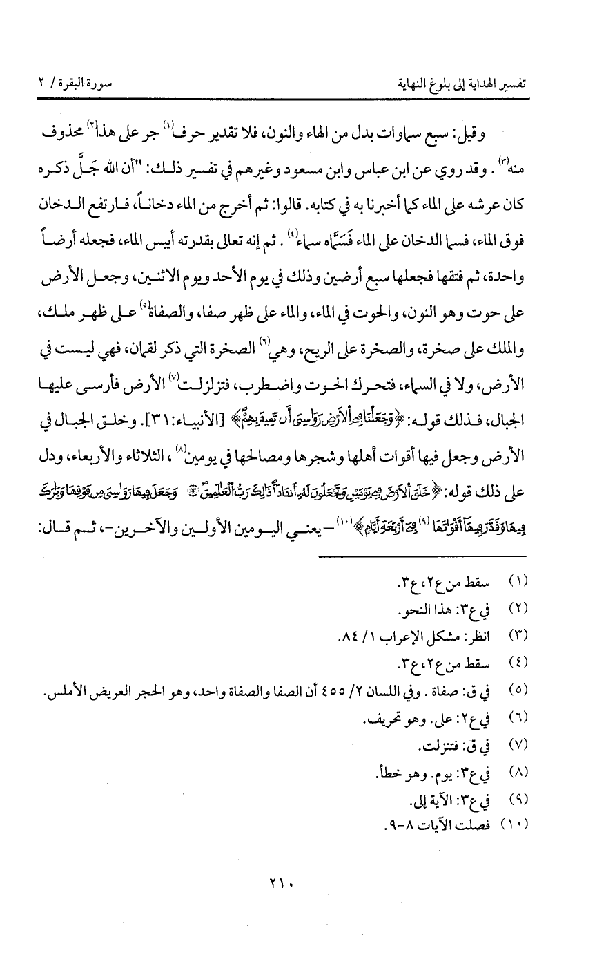 وقيل: سبع سماوات بدل من الهاء والنون، فلا تقدير حرف جر على هذا محذوف منه. وقد روي عن ابن عباس وابن مسعود وغيرهم في تفسير ذلك: " أن الله جَلَّ ذكره كان عرشه على الماء كما أخبرنا به في كتابه. قالوا: ثم أخرج من الماء دخاناً، فارتفع الدخان فوق الماء، فسما الدخان على الماء فَسَمَّاه سماء. ثم إنه تعالى بقدرته أيبس الماء، فجعله أرضاً واحدة، ثم فتقها فجعلها سبع أرضين وذلك في يوم الأحد ويوم الاثنين، وجعل الأرض على حوت وهو النون، والحوت في الماء، والماء على ظهر صفا، والصفاة على ظهر ملك، والملك على صخرة، والصخرة على الريح، وهي الصخرة التي ذكر لقمان، فهي ليست في الأرض، ولا في السماء، فتحرك الحوت واضطرب، فتزلزلت الأرض فأرسى عليها الجبال، فذلك قوله: {وَجَعَلْنَا فِي الأرض رَوَاسِيَ أَن تَمِيدَ بِهِمْ} [الأنبياء: 31]. وخلق الجبال في الأرض وجعل فيها أقوات أهلها وشجرها ومصالحها في يومين، الثلاثاء والأربعاء، ودل على ذلك قوله: