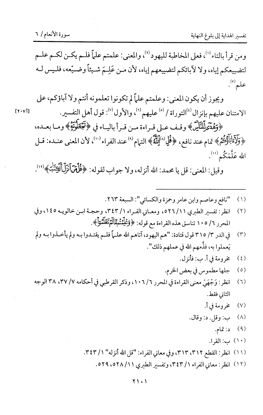{وَهُدًى لِّلنَّاسِ} وقف على قراءة من قرأ بالياء في {تَجْعَلُونَهُ} وما بعده، {وَلاَءَابَآؤُكُمْ} تمام عند نافع، {قُلِ الله} التمام عند الفراء، لأن المعنى عنده: قل الله عَلَّمَكُم.