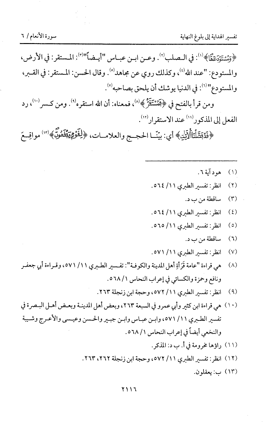 {وَمُسْتَوْدَعَهَا} [هود: 6]: في الصلب. وعن ابن عباس " أيضاً ": المستقر: في الأرض، والمستودع: " عند الله، وكذلك روي عن مجاهد. وقال الحسن: المستقر: في القبر، والمستودع ": في الدنيا يوشك أن يلحق بصاحبه.
