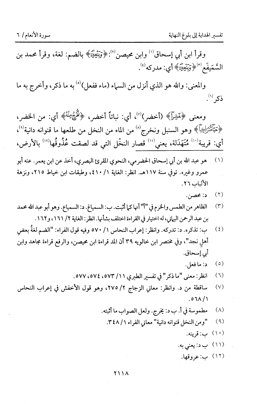 ومعنى {خَضِراً} (أخضر)، أي: نباتاً أخضر، {نُّخْرِجُ مِنْهُ} أي: من الخضر، {حَبّاً مُّتَرَاكِباً} وهو السنبل ونخرج من الماء من النخل من طلعها ما قنوانه دانية، أي: قريبة مُتَهَدَلة، يعني قصار النخْل التي قد لصقت عُذُوقُها بالأرض،