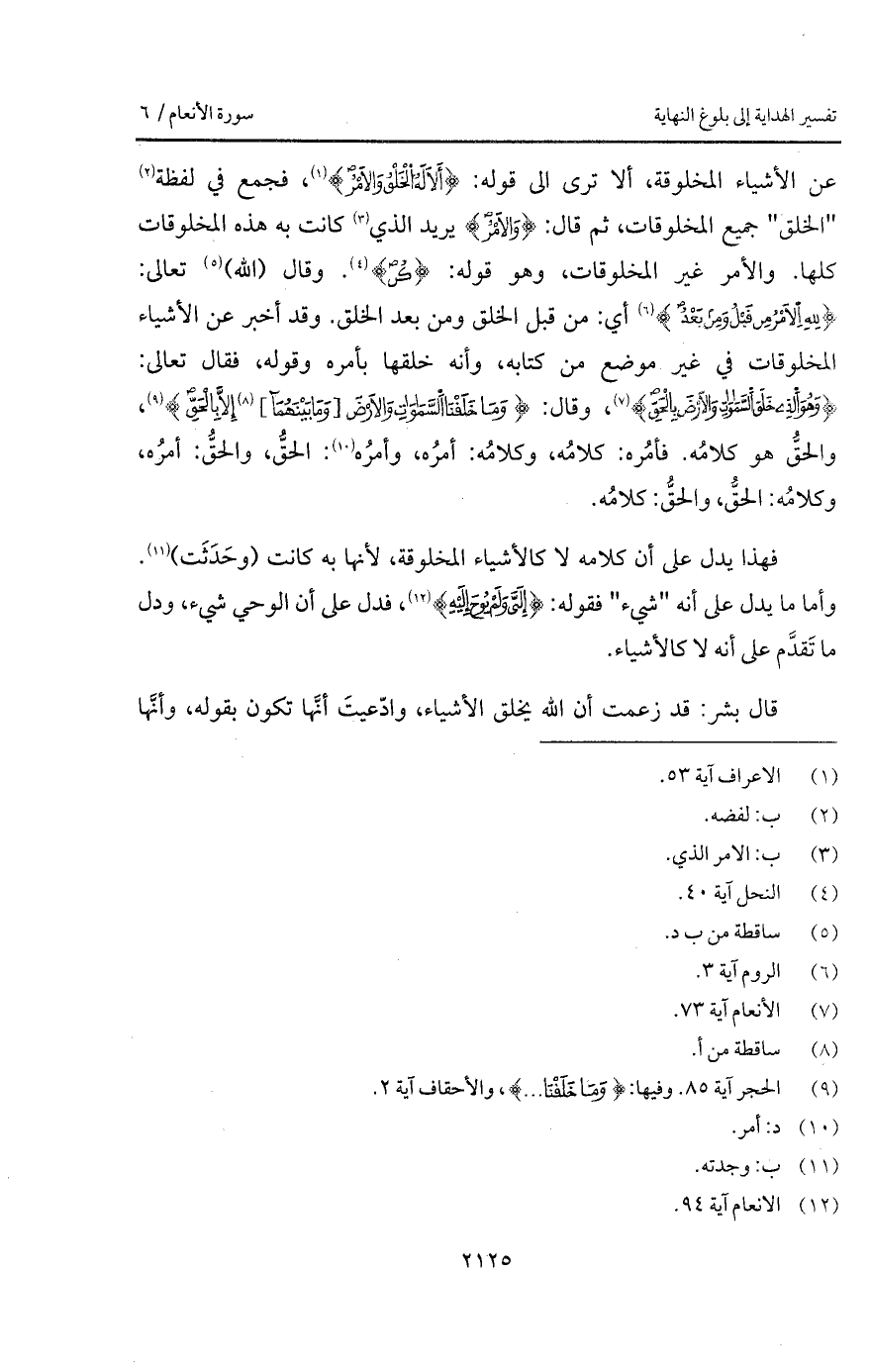 عن الأشياء المخلوقة، ألا ترى إلى قوله: {أَلاَ لَهُ الخلق والأمر} [الأعراف: 54]، فجمع في لفظة " الخلق " جميع المخلوقات، ثم قال: {والأمر} يريد الذي كانت به هذه المخلوقات كلها. والأمر غير المخلوقات، وهو قوله: {كُنْ} [النحل: 40]. وقال (الله) تعالى: {لِلَّهِ الأمر مِن قَبْلُ وَمِن بَعْدُ} [الروم: 4] أي: من قبل الخلق ومن بعد الخلق. وقد أخبر عن الأشياء المخلوقات في غير موضع من كتابه، وأنه خلقها بأمره وقوله، فقال تعالى: {وَهُوَ الذي خَلَقَ السماوات والأرض بالحق} [الأنعام: 73]، وقال: {وَمَا خَلَقْنَا السماوات والأرض وَمَا بَيْنَهُمَآ إِلاَّ بالحق} [الحجر: 85، الأحقاف: 3]، والحقُّ هو كلامُه. فأمُره، كلامُه، وكلامُه: أمرُه، وأمرُه: الحقُّ، والحقُّ: أمرُه، وكلامُه: الحقُّ، والحقُّ: كلامُه.