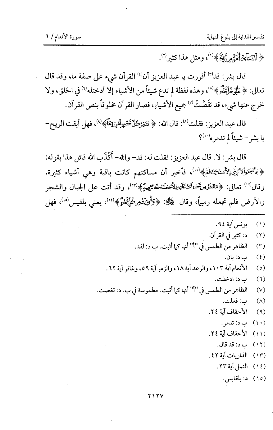 قال بشر: لا. قال عبد العزيز: فقلت له: قد - والله - أَكْذَب الله قائل هذا بقوله: {فَأْصْبَحُواْ لاَ يرى إِلاَّ مَسَاكِنُهُمْ} [الأحقاف: 25]، فأخبر أن مساكنهم كانت باقية وهي أشياء كثيرة، وقال تعالى: {مَا تَذَرُ مِن شَيْءٍ أَتَتْ عَلَيْهِ إِلاَّ جَعَلَتْهُ كالرميم} [الذاريات: 42]، وقد أتت على الجبال والشجر والأرض فلم تجعله رميماً، وقال D: { وَأُوتِيَتْ مِن كُلِّ شَيْءٍ} [النمل: 23]، يعني بلقيس، فهل