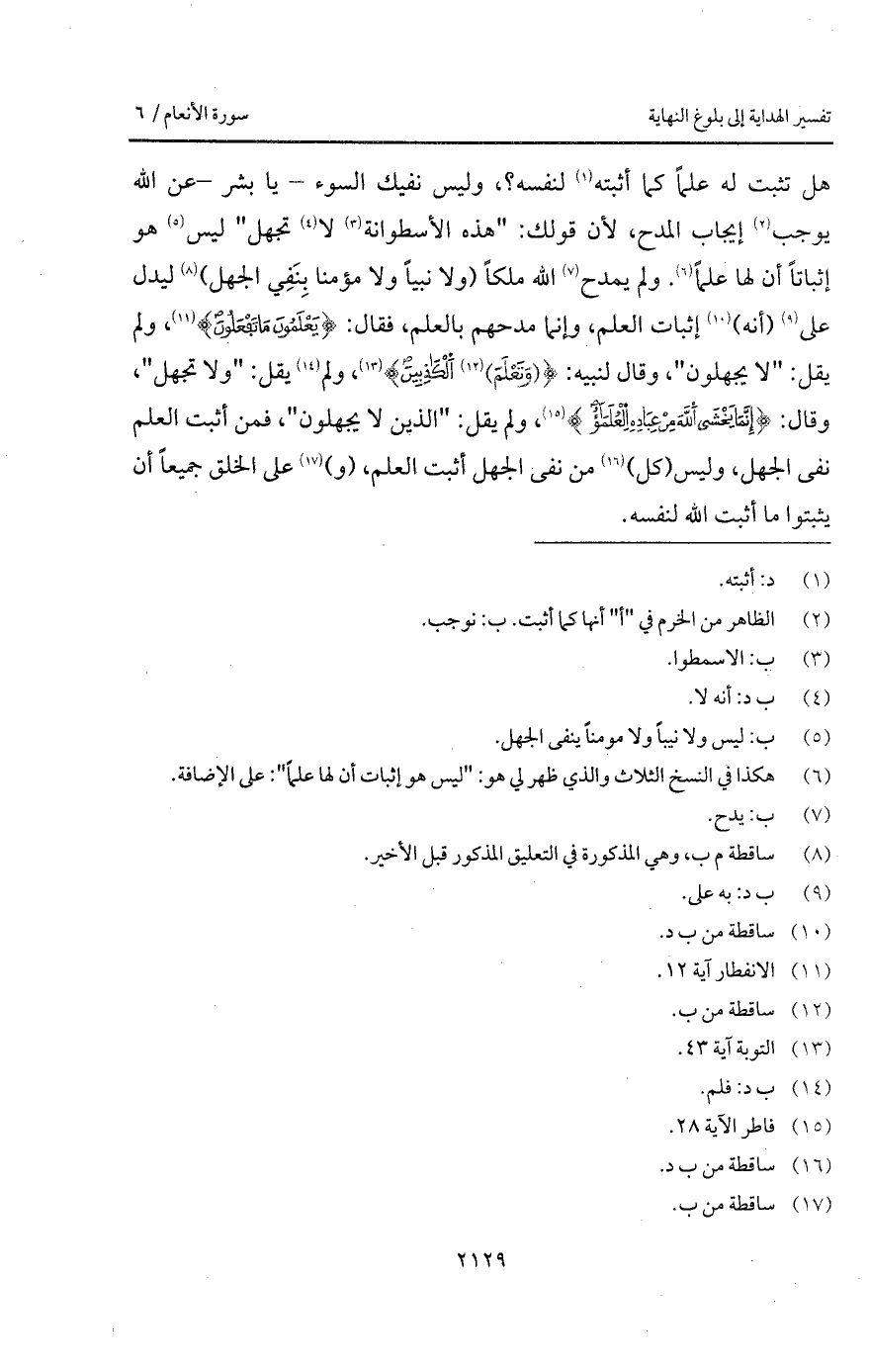 هل تثبت له علماً كما أثبته لنفسه؟، وليس نفيك السوء - يا بشر - عن الله يوجب إيجاب المدح، لأن قولك: " هذه الأسطوانة لا تجهل " ليس هو إثباتاً أن لها علماً. ولم يمدح الله ملكاً (ولا نبياً ولا مؤمنا بِنَفِي الجهل) ليدل على (أنه) إثبات العلم، وإنما مدحهم بالعلم، فقال: {يَعْلَمُونَ مَا تَفْعَلُونَ} [الانفطار: 12]، ولم يقل: " لا يجهلون "، وقال لنبيه: {(وَتَعْلَمَ) الكاذبين} [التوبة: 43]، ولم يقل: " ولا تجهل "، وقال: {إِنَّمَا يَخْشَى الله مِنْ عِبَادِهِ العلماء} [فاطر: 28]، ولم يقل: " الذين لا يجهلون "، فمن أثبت العلم نفى الجهل، وليس (كل) من نفى الجهل أثبت العلم، (و) على الخلق جميعاً أن يثبتوا ما أثبت الله لنفسه.