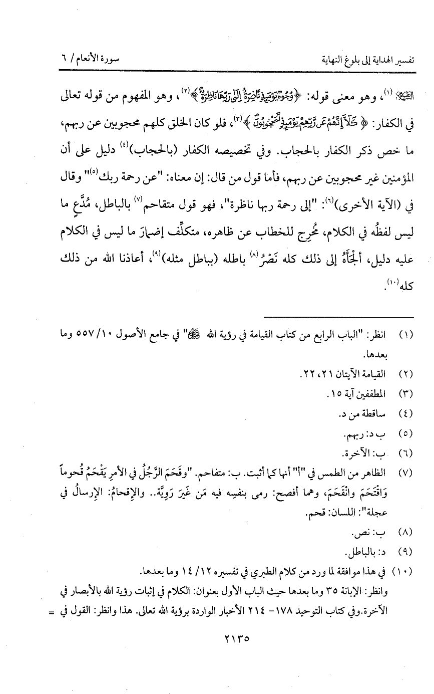 عليه السلام، وهو معنى قوله: {وُجُوهٌ يَوْمَئِذٍ نَّاضِرَةٌ * إلى رَبِّهَا نَاظِرَةٌ} [القيامة: 22، 23]، وهو المفهوم من قوله تعالى في الكفار: {كَلاَّ إِنَّهُمْ عَن رَّبِّهِمْ يَوْمَئِذٍ لَّمَحْجُوبُونَ} [المطففين: 15]، فلو كان الخلق كلهم محجوبين عن ربهم، ما خص ذكر الكفار بالحجاب. وفي تخصيصه الكفار (بالحجاب) دليل على أن المؤمنين غير محجوبين عن ربهم، فأما قول من قال: إن معناه: " عن رحمة ربك " وقال في (الآية الأخرى): " إلى رحمة ربها ناظرة "، فهو قول متقاحم بالباطل، مُدَّعٍ ما ليس لفظُه في الكلام، مُخرِج للخطاب عن ظاهره، متكلِّف إضمارَ ما ليس في الكلام عليه دليل، ألْجَأَهُ إلى ذلك كله نَصْرُ باطله (بباطل مثله)، أعاذنا الله من ذلك كله.
