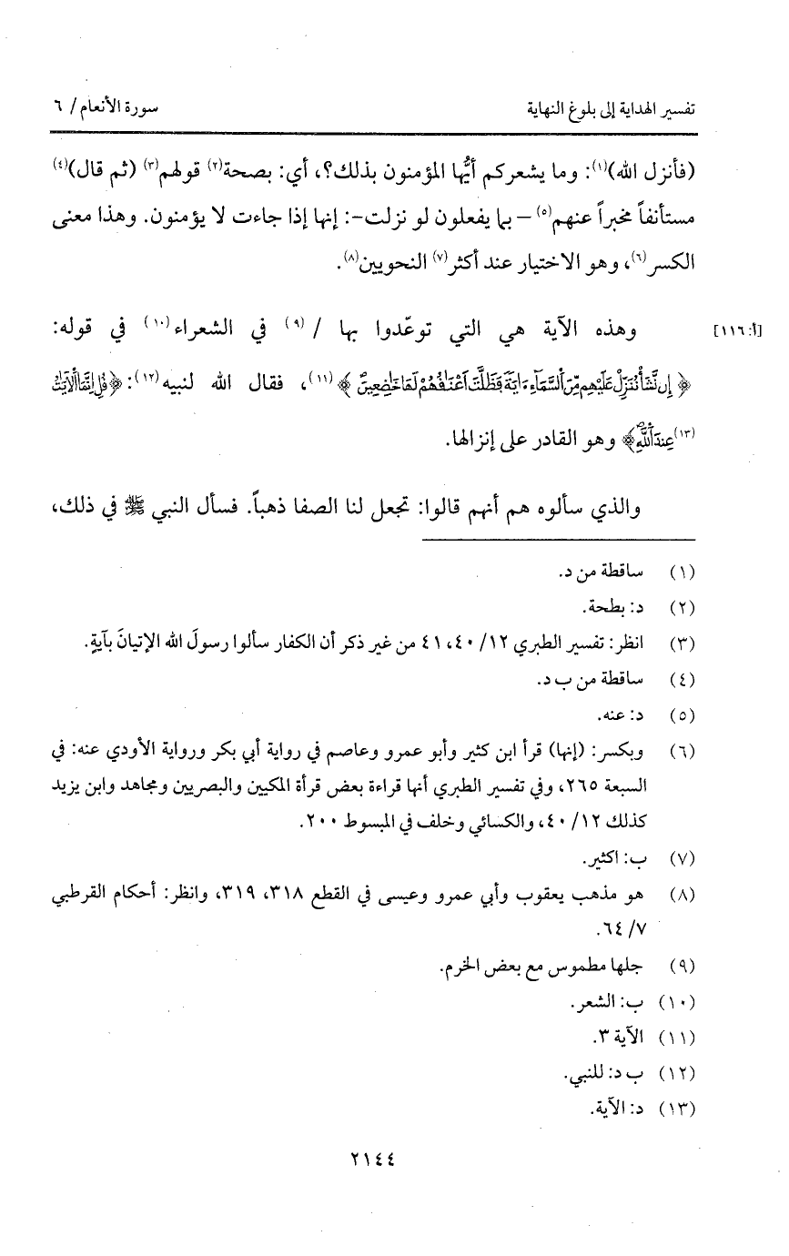(فأنزل الله): وما يشعركم أيُّها المؤمنون بذلك؟، أي: بصحة قولهم (ثم قال) مستأنفاً مخبراً عنهم - بما يفعلون لو نزلت -: إنها إذا جاءت لا يؤمنون. وهذا معنى الكسر، وهو الاختيار عند أكثر النحويين.
