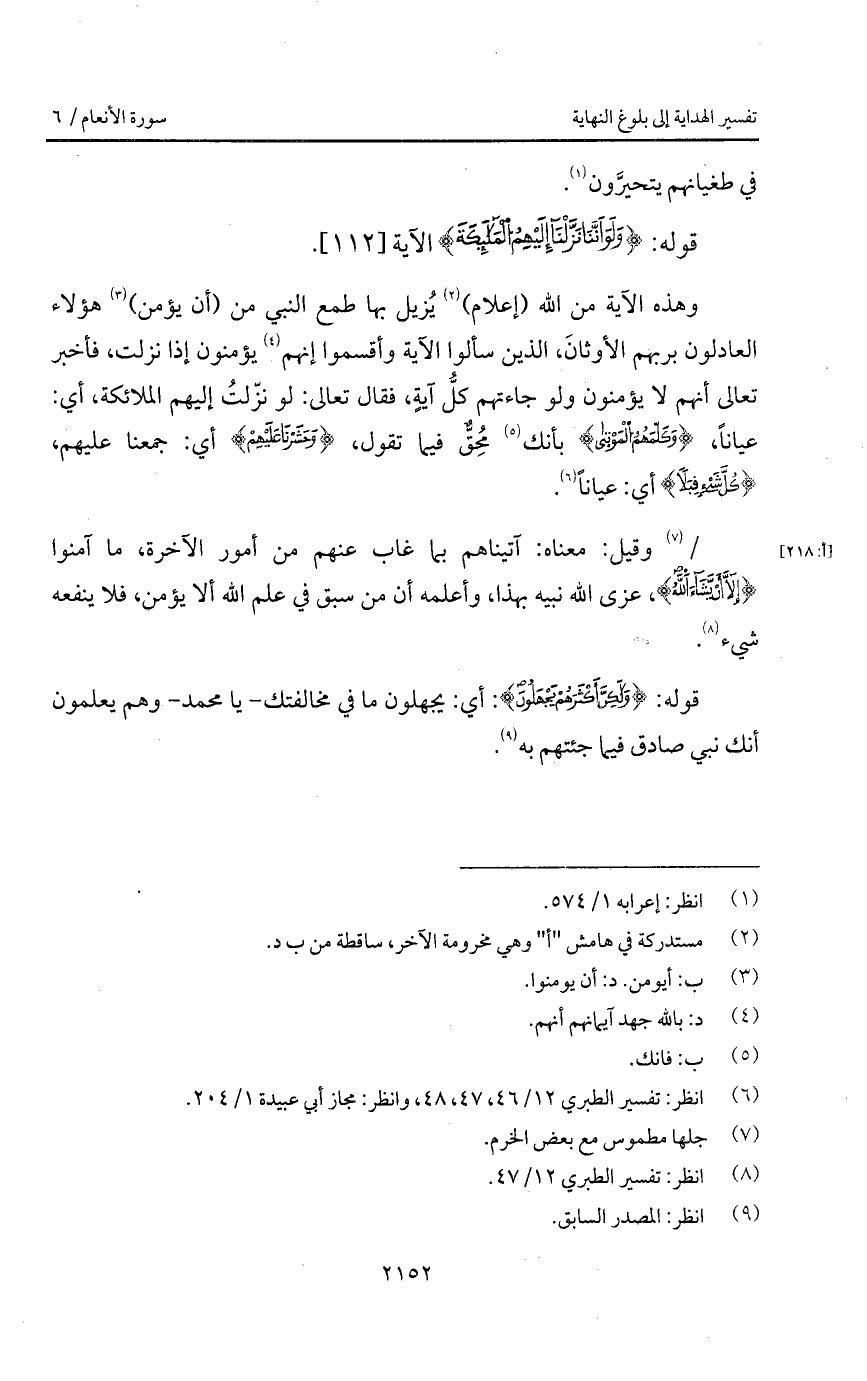 وهذه الآية من الله (إعلام) يُزيل بها طمع النبي من (أن يؤمن) هؤلاء العادلون بربهم الأوثانَ، الذين سألوا الآية وأقسموا إنهم يؤمنون إذا نزلت، فأخبر تعالى أنهم لا يؤمنون ولو جاءتهم كلُّ آيةٍ، فقال تعالى: لو نزّلتُ إليهم الملائكة، أي: عياناً {وَكَلَّمَهُمُ الموتى} بأنك مُحِقٌّ فيما تقول، {وَحَشَرْنَا عَلَيْهِمْ} أي: جمعنا عليهم، {كُلَّ شَيْءٍ قُبُلاً} أي: عياناً.