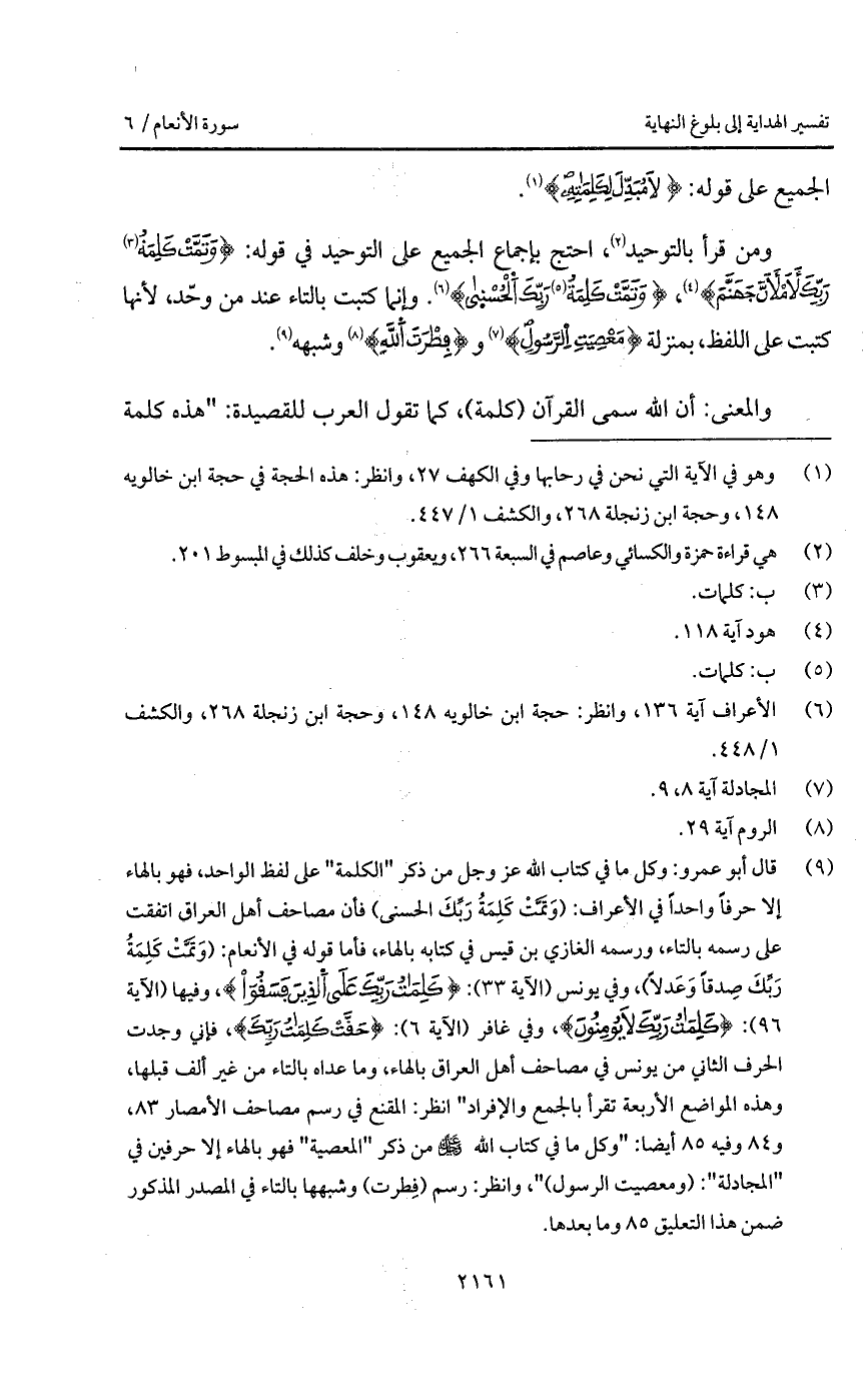 ومة قرأ بالتوحيد، احتج بإجماع الجميع على التوحيد في قوله: {وَتَمَّتْ كَلِمَةُ رَبِّكَ لأَمْلأَنَّ جَهَنَّمَ} [هود: 119]، {وَتَمَّتْ كَلِمَةُ رَبِّكَ الحسنى} [الأعراف: 137]. وإنما كتبت بالتاء عند من وحّد، لأنها كتبت على اللفظ، بمنزلة {وَمَعْصِيَتِ الرسول} [المجادلة: 8، 9] و {فِطْرَتَ الله} [الروم: 30] وشبهه.