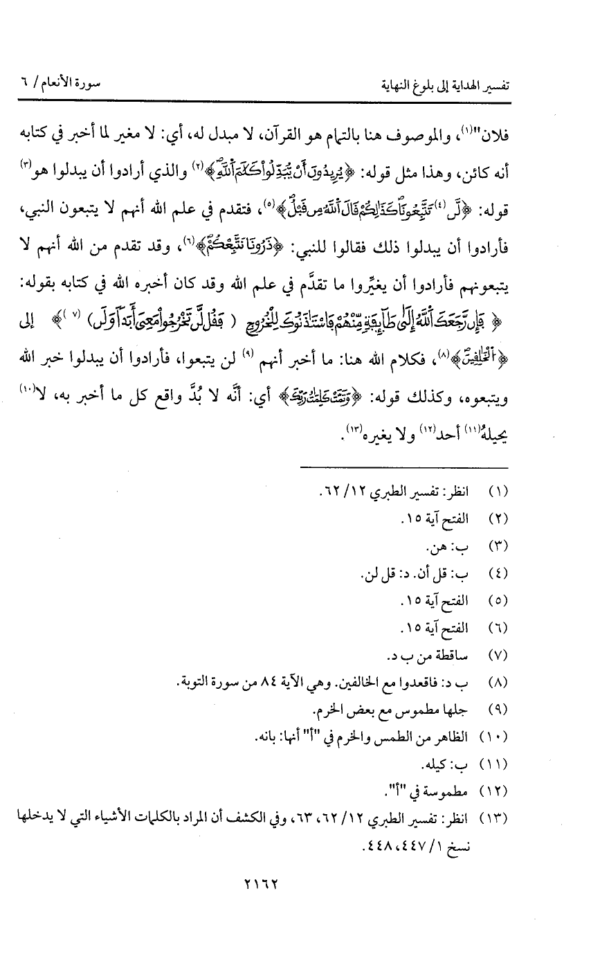 فلان "، والموصوف هنا بالتمام هو القرآن، لا مبدل له، أي: لا مغير لما أخبر في كتابه أنه كائن، وهذا مثل قوله: {يُرِيدُونَ أَن يُبَدِّلُواْ كَلاَمَ الله} [الفتح: 15] والذي أرادوا أن يبدلوا هو قوله: {لَّن تَتَّبِعُونَا كذلكم قَالَ الله مِن قَبْلُ} [الفتح: 15]، فتقدم في علم الله أنهم لا يتبعون النبي، فأرادوا أن يبدلوا ذلك فقالوا للنبي: {ذَرُونَا نَتَّبِعْكُمْ} [الفتح: 15]، وقد تقدم من الله أنهم لا يتبعونهم فأرادوا أن يغيِّروا ما تقدَّم في علم الله وقد كان أخبره الله في كتابه بقوله: {فَإِن رَّجَعَكَ الله إلى طَآئِفَةٍ مِّنْهُمْ فاستأذنوك لِلْخُرُوجِ (فَقُلْ لَّن تَخْرُجُواْ مَعِيَ أَبَداً وَلَن)} [التوبة: 83] إلى {الخالفين} [التوبة: 83]، فكلام الله هنا: ما أخبر أنهم لن يتبعوا، فأرادوا أن يبدلوا خبر الله ويتبعوه، وكذلك قوله: {وَتَمَّتْ كَلِمَتُ رَبِّكَ} أي: أنَّه لا بُدَّ واقع كل ما أخبر به، لا يحيلهُ أحد ولا يغيره.
