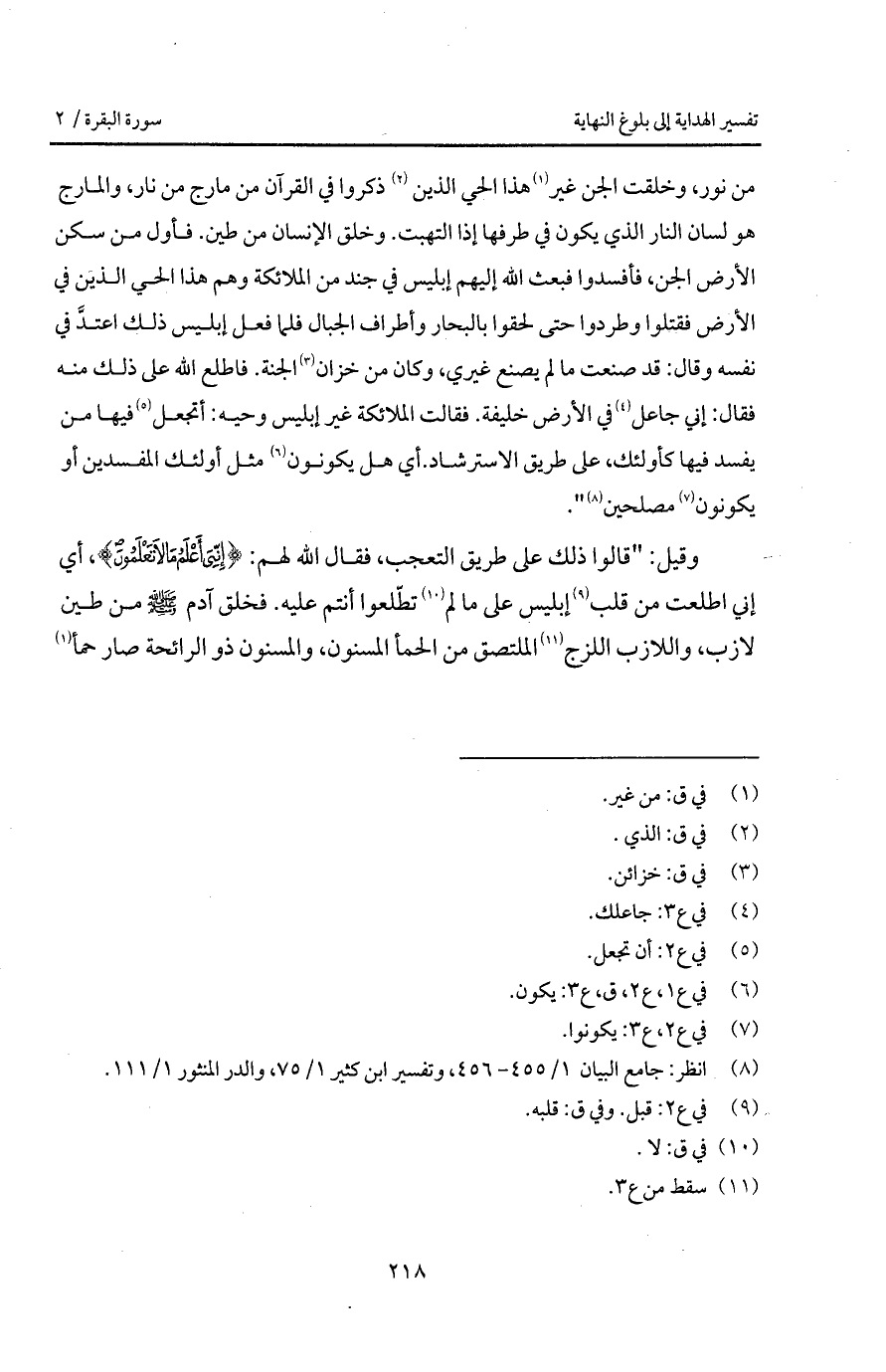 من نور، وخلقت الجن غير هذا الحي الذين ذكروا في القرآن من مارج من نار، والمارج هو لسان النار الذي يكون في طرفها إذا التهبت. وخلق الإنسان من طين. فأول من سكن الأرض الجن، فأفسدوا فبعث الله إليهم إبليس في جند من الملائكة وهم هذا الحي الذين في الأرض فقتلوا وطردوا حتى لحقوا بالبحار وأطراف الجبال فلما فعل إبليس ذلك اعتدَّ في نفسه وقال: قد صنعت ما لم يصنع غيري، وكان من خزان الجنة.