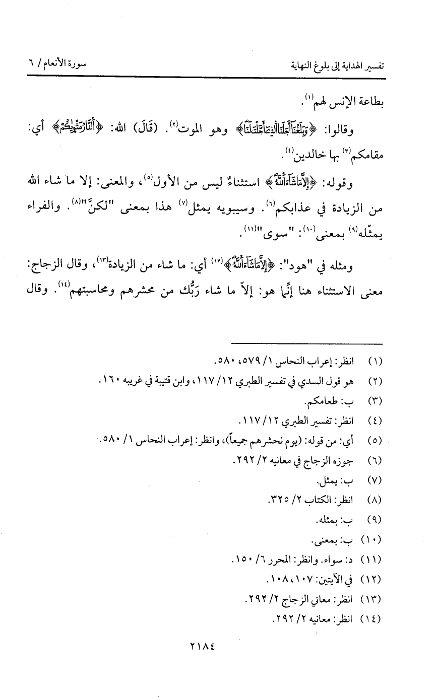 ومثله في " هود ": {إِلاَّ مَا شَآءَ الله} أي: ما شاء من الزيادة، وقال الزجاج: معنى الاستثناء هنا إنِّما هو: إلاّ ما شاء رَبُّك من محشرهم ومحاسبتهم. وقال