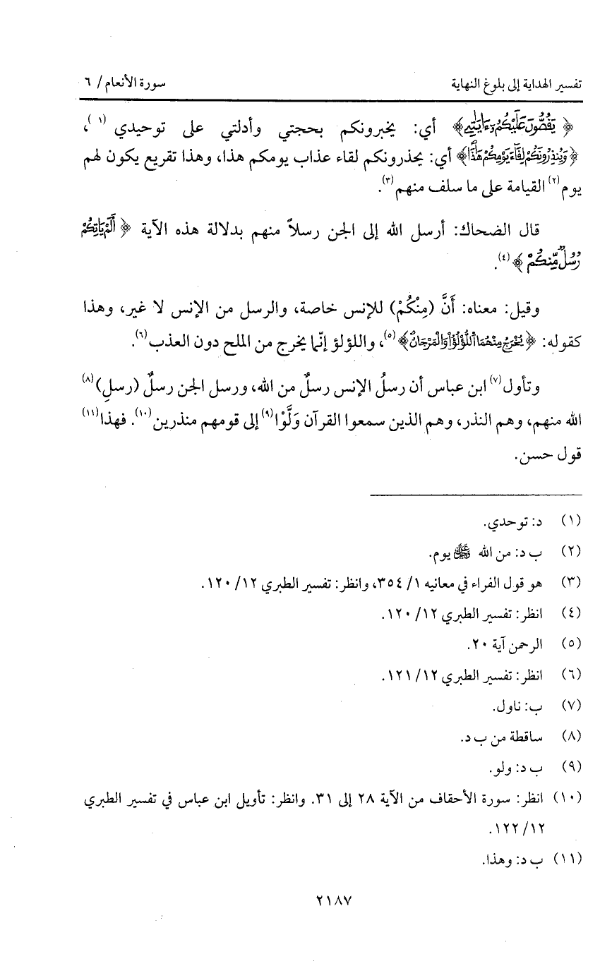وتأول ابن عباس أن رسلُ الإنس رسلٌ من الله، ورسل الجن رسلٌ (رسلِ) الله منهم، وهم النذر، وهم الذين سمعوا القرآن وَلَّوْا إلى قومهم منذرين. فهذا قول حسن.