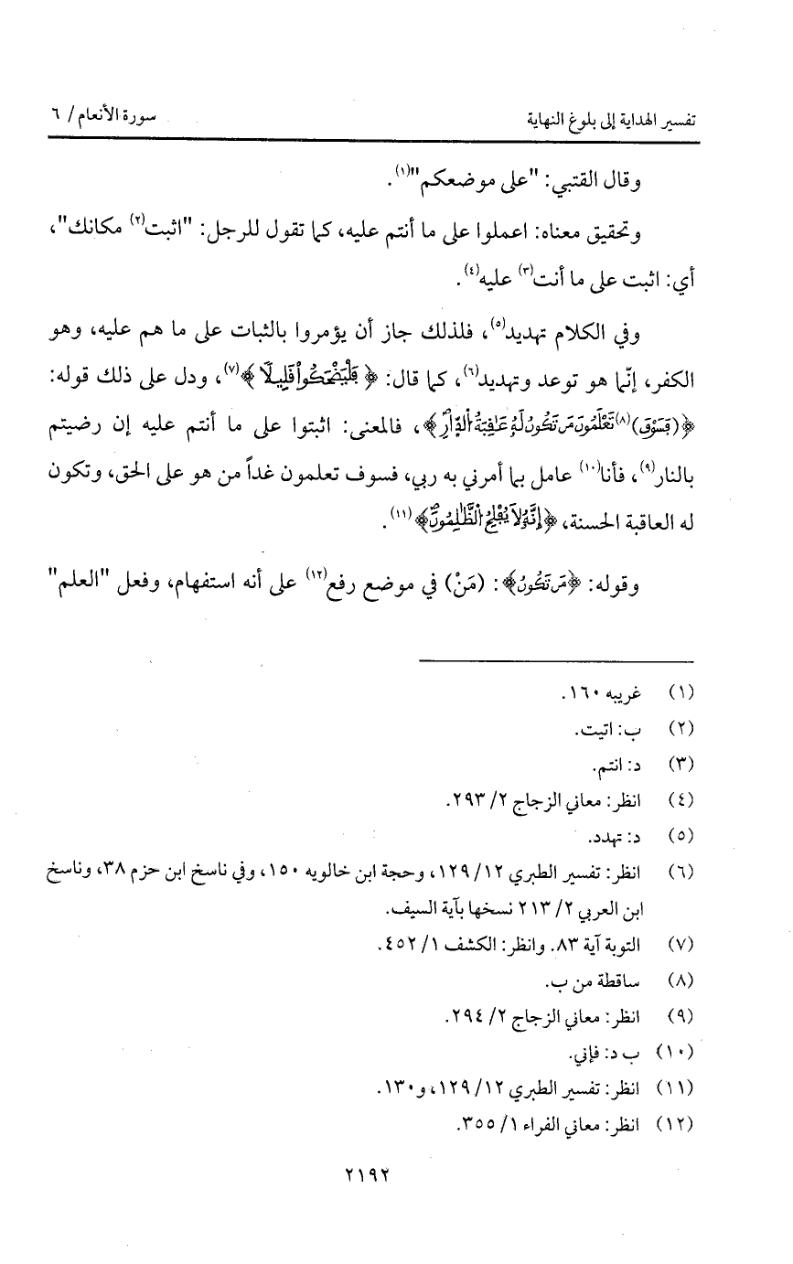 وفي الكلام تهديد، فلذلك جاز أن يؤمروا بالثبات على ما هم عليه، وهو الكفر، إنّما هو توعد وتهديد، كما قال: {فَلْيَضْحَكُواْ قَلِيلاً} [التوبة: 82]، ودل على ذلك قوله: {(فَسَوْفَ) تَعْلَمُونَ مَن تَكُونُ لَهُ عاقبة الدار}، فالمعنى: اثبتوا على ما أنتم عليه إن رضيتم بالنار، فأنا عامل بما أمرني به ربي، فسوف تعلمون غداً من هو على الحق، وتكون له العاقبة الحسنة، {إِنَّهُ لاَ يُفْلِحُ الظالمون}.