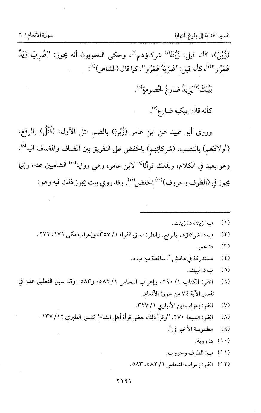 وروى أبو عبيد عن ابن عامر (زُيّنَ) بالضم مثل الأول، (قَتْلُ) بالرفع، (أولادَهم) بالنصب، (شركائِهم) بالخفض على التفريق بين المضاف والمضاف اليه، وهو بعيد في الكلام، وبذلك قرأنا لابن عامر، وهي رواية الشاميين عنه، وإنما يجوز في (الظرف وحروف) الخفض. وقد روي بيت يجوز ذلك فيه وهو: