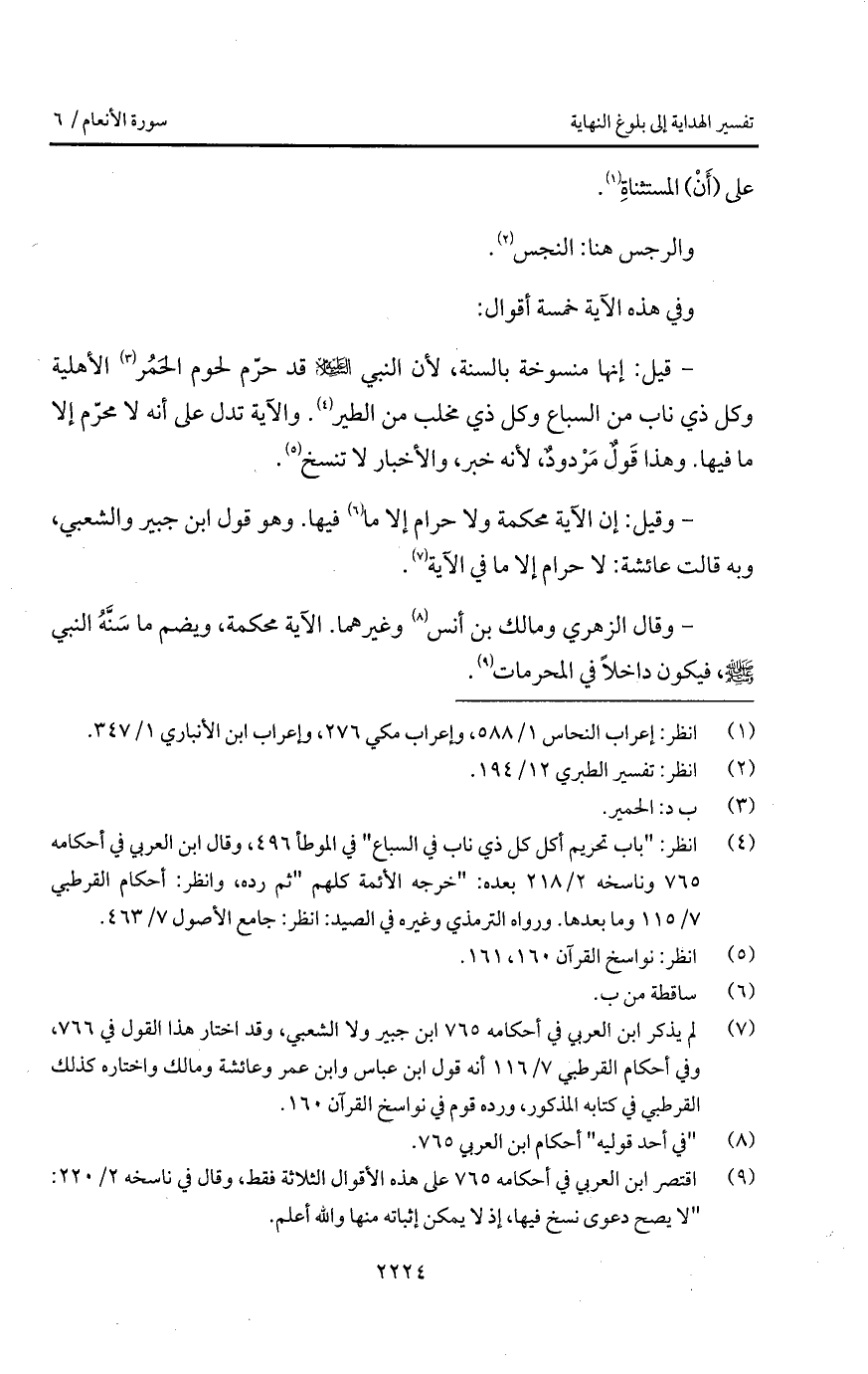 - قيل: إنها منسوخة بالسنة، لأن النبي عليه السلام قد حرّم لحوم الحَمُر الأهلية وكل ذي ناب من السباع وكل ذي مخلب من الطير. والآية تدل على أنه لا محرّم إلا ما فيها. وهذا قَولٌ مَرْدودٌ، لأنه خبر، والأخبار لا تنسخ.