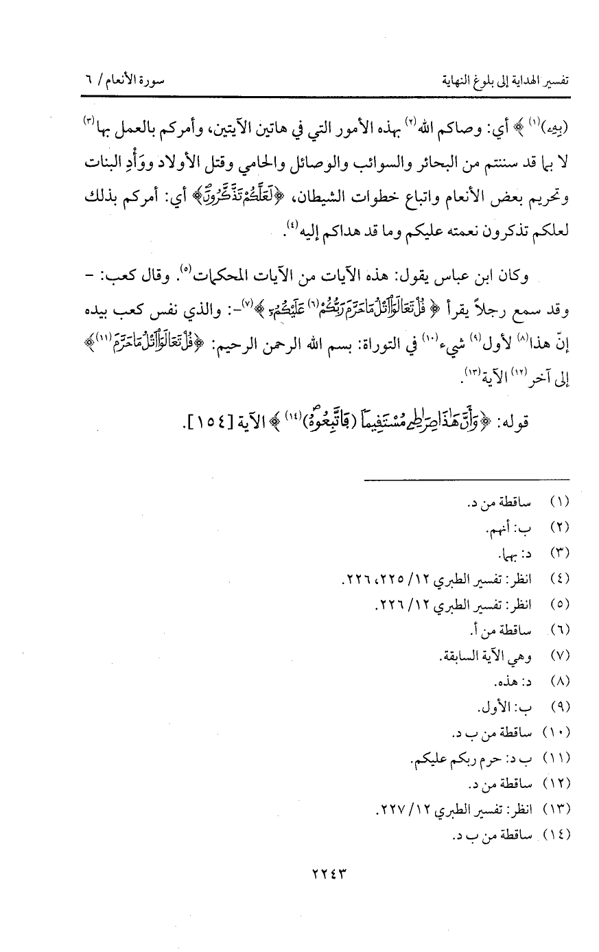 وكان ابن عباس يقول: هذه الآيات من الآيات المحكمات. وقال كعب: - وقد سمع رجلاً يقرأ {قُلْ تَعَالَوْاْ أَتْلُ مَا حَرَّمَ رَبُّكُمْ عَلَيْكُمْ} [الأنعام: 151]-: والذي نفس كعب بيده إنّ هذا لأول شيء في التوراة: بسم الله الرحمن الرحيم: {قُلْ تَعَالَوْاْ أَتْلُ مَا حَرَّمَ رَبُّكُمْ} [الأنعام: 151] إلى آخر الآية.