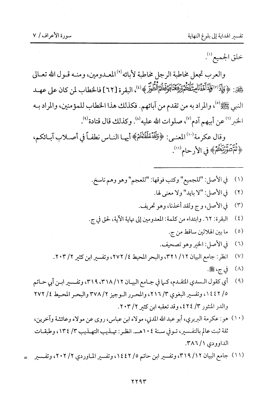 والعرب تجعل مخاطبة الرجل لأبائه المعدومين، ومنه قول الله تعالى D: { وَإِذْ أَخَذْنَا مِيثَاقَكُمْ وَرَفَعْنَا فَوْقَكُمُ الطور} [البقرة: 63]، فالخطاب لمن كان على عهد النبي A، والمراد به من تقدم من آبائهم. فكذلك هذا الخطاب للمؤمنين، والمراد به الخبر عن أبيهم آدم، صلوات الله عليه. وكذلك قال قتادة.