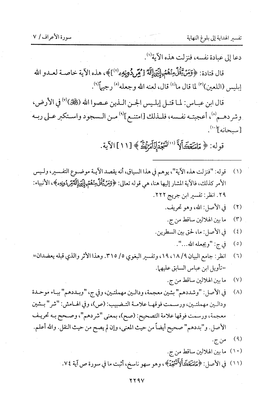 قال قتادة: {وَمَن يَقُلْ مِنْهُمْ إني إله [مِّن دُونِهِ]} [الأنبياء: 29]، هذه الآية خاصة لعدو الله إبليس (اللعين) لما قال ما قال، لعنه الله وجعله رجيماً.