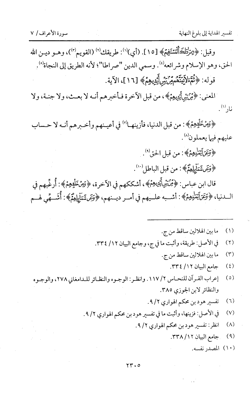 قال ابن عباس: {مِّن بَيْنِ أَيْدِيهِمْ}، أشككهم في الآخرة، {وَمِنْ خَلْفِهِمْ}: أُرغِّبهم في الدينا، {وَعَنْ أَيْمَانِهِمْ}: أشبه عليهم في أمر دينهم، {وَعَن شَمَآئِلِهِمْ}: أُشَهِّي لهم