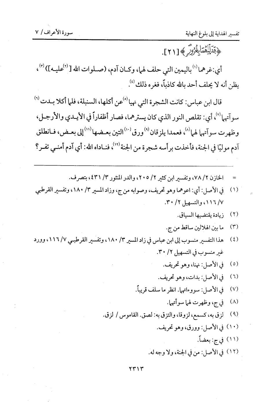 قال ابن عباس: كانت الشجرة التي نهيا عن أكلها، السنبلة، فلما أكلا بدت سوآتهما، أي: تقلص النور الذي كان يسترهما، فصار أظفاراً في الأيدي والأرجل، وظهرت سوآتهما لهما، فعمدا يلزقان ورق التين بعضها إلى بعض، فانطلق آدم موليّا في الجنة، فأخذت برأسه شجرة من الجنة، فناداه الله: آي آدم أمني تفر؟