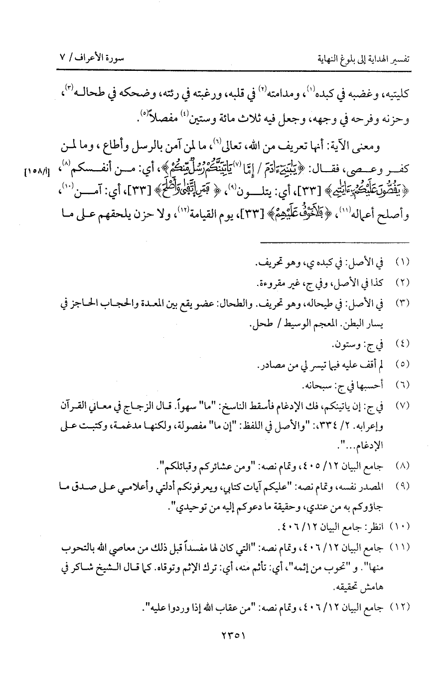 ومعنى الآية: أنها تعريف من الله، تعالى، ما لمن آمن بالرسل وأطاع، وما لمن كفر وعصى، فقال: {يابنيءَادَمَ/ إِمَّا يَأْتِيَنَّكُمْ رُسُلٌ مِّنكُمْ}، أي: من أنفسكم، {يَقُصُّونَ عَلَيْكُمْ آيَاتِي}، أي: يتلون، {فَمَنِ اتقى وَأَصْلَحَ}، أي: آمن، وأصلح أعماله، {فَلاَ خَوْفٌ عَلَيْهِمْ}، يوم القيامة، ولا حزن يلحقهم على ما
