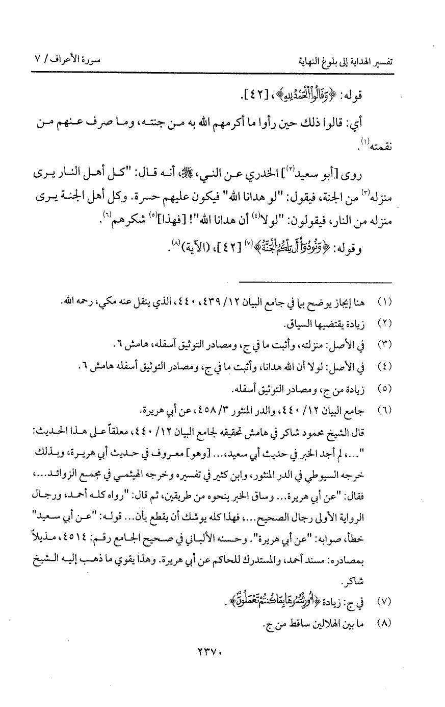 روى [أبو سعيد] الخدري ع النبي، A، أنه قال: " كل أهل النار يرى منزله من الجنة، فيقول: " لو هدانا الله " فيكون عليهم حسرة. وكل أهل الجنة يرى منزله من النار، فيقولون: " لولا أن هدانا الله "! [فهذا] شكرهم.
