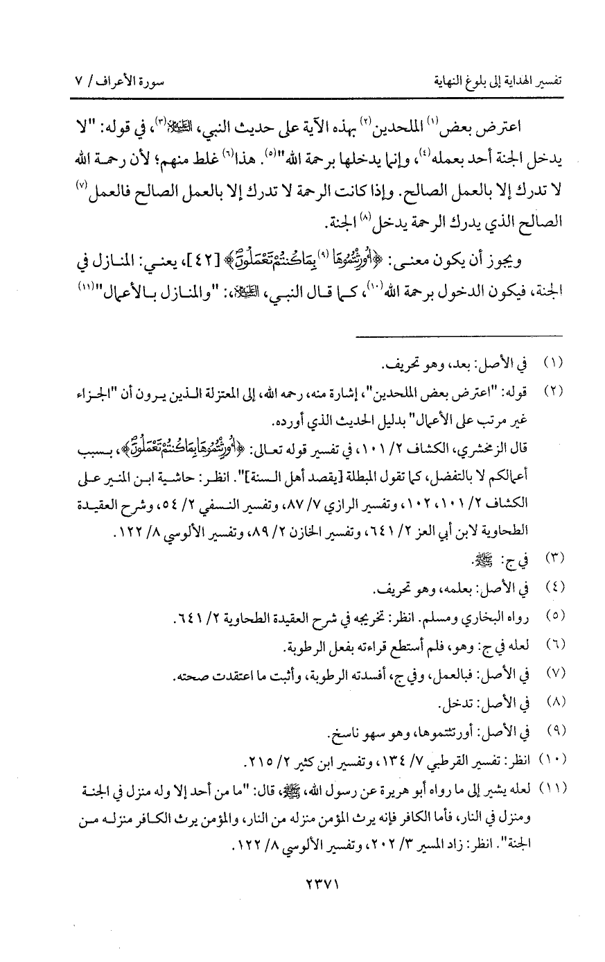 اعترض بعض الملحدين بهذه الآية على حديث النبي، عليه السلام، في قوله: " لا يدخل الجنة أحد بعمله، وإنما يدخلها برحمة الله " هذا غلط منهم؛ لأن رحمة الله لا تدرك إلا بالعمل الصالح. وإذا كانت الرحمة لا تدرك إلا بالعمل الصالح فالعمل الصالح الذي يدرك الرحمة يدخل الجنة.