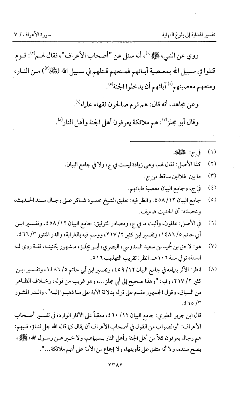 روي عن النبي، A، " أنه سئل عن " أصحاب الأعراف "، فقال لهم: قوم قتلوا في سبيل الله بمعصية آبائهم فمنعهم قتلهم في سبيل الله ( D) من النار، ومنعهم معصيتهم آبائهم أن يدخلوا الجنة ".