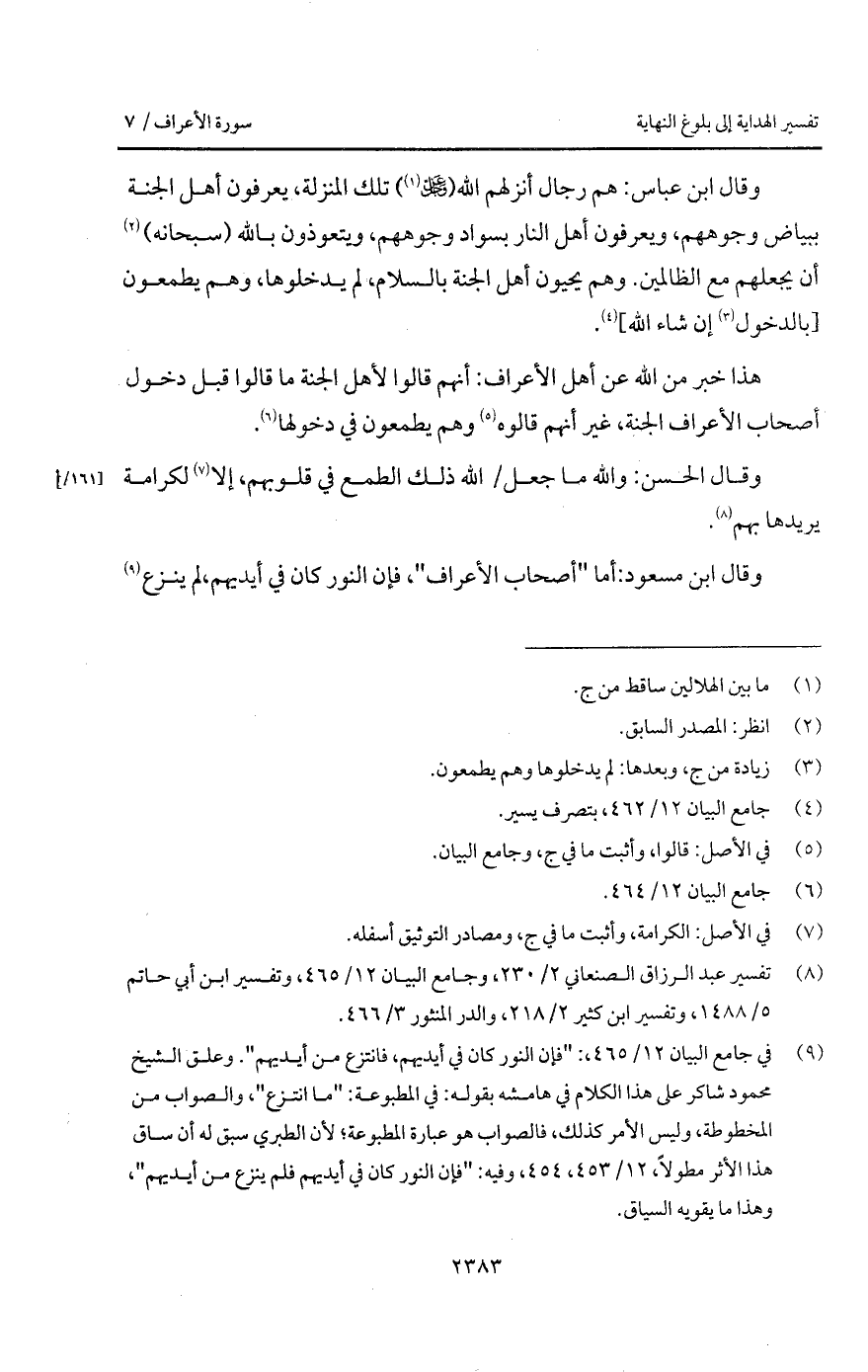 وقال ابن عباس: هم رجال أنزلهم الله ( D) تلك المنزلة، يعرفون أهل الجنة ببياض وجوههم، ويعرفون أهل النار بسواد وجوههم، ويتعوذون بالله (سبحانه) أن يجعلهم من الظالمين. وهم يحيون أهل الجنة بالسلام، لم يدخلوها، وهم يطمعون [بالدخول إن شاء الله].