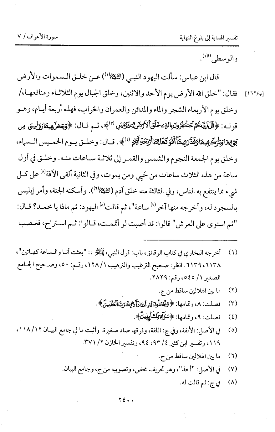 قال ابن عباس: " سألت اليهود النبي (عليه السلام) عن خلق السموات والأرض فقال: " خلق الله الأرض يوم الأحد والأثنين، وخلق الجبال يوم الثلاثاء ومنافعها، / وخلق يوم الأربعاء الشجر والماء والمدائن والعمران والخراب، فهذه أربعة أيام، وهو قوله: {قُلْ أَإِنَّكُمْ لَتَكْفُرُونَ بالذي خَلَقَ الأرض فِي يَوْمَيْنِ}، ثم قال: {وَجَعَلَ فِيهَا رَوَاسِيَ مِن فَوْقِهَا وَبَارَكَ فِيهَا وَقَدَّرَ فِيهَآ أَقْوَاتَهَا في أَرْبَعَةِ أَيَّامٍ}. قال: وخلق يوم الخميس السماء، وخلق يوم الجمعة النجوم والشمس والقمر إلى ثلاثة ساعات منه. وخلق في أول ساعة من هذه الثلاث ساعات من حَيِي ومن يموت، وفي الثانية ألقى الآفة على كل شيء مما ينتفع به الناس، وفي الثالثة منه خلق آدم (عليه السلام). وأسكنه الجنة، وأمر إبليس بالسجود له، وأخرجه منها آخر ساعة "، ثم قالت اليهود: ثم ماذا يا محمد؟ قال: " ثم استوى على العرش " قالوا: قد أصبت لو أتممت، قالوا: ثم استراح، فغضب