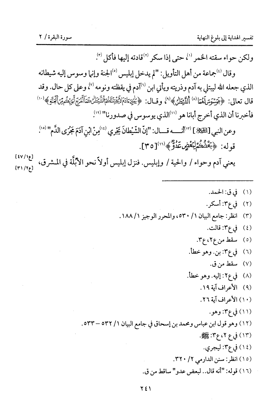 {فَوَسْوَسَ لَهُمَا الشيطان} [الأعراف: 20]، وقال: {يابنيءَادَمَ لاَ يَفْتِنَنَّكُمُ الشيطان كَمَآ أَخْرَجَ أَبَوَيْكُمْ مِّنَ الجنة} [الأعراف: 27] فأخبرنا أن الذي أخرج أبانا هو الذي يوسوس في صدورنا ".