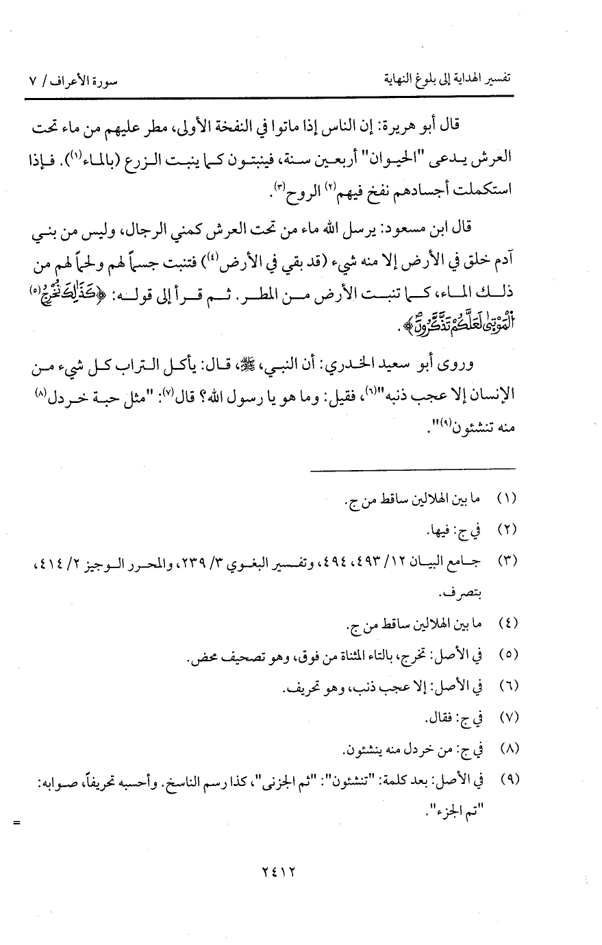 قال أبو هريرة: إن الناس إذا ماتوا في النخفة الأولى، مطر عليهم من ماء تحت العرش يدعى " الحيوان " أربعين سنة، فينبتون كما ينبت الزرع [بالماء). فإذا استكلمت أجسادهم نفخ فيهم الروح.