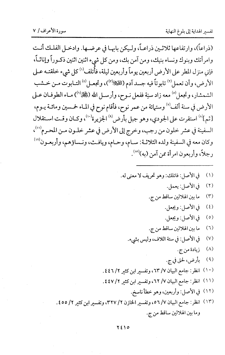 (ذراعاً)، وارتفاعها ثلاثين ذراعاً، وليكن بابها في عرضها. وادخل الفلك أنت وامرأتك وبنوك ونساء بنيك، ومن آمن بك، ومن كل شيء اثنين اثنين ذكوراً وإناثاً، فإني منزل المطر على الأرض أربعين يوماً وأربعين ليلة، فأُتلف كل شيء خلقته على الأرض، وأن تعمل تابوتاً فيه جسد آدم (عليه السلام)، وتجعل التابوت من خشب الشمشار، وتجعل معه زاد سِنة ففعل نوح، وأرسل الله ( D) ماء الطوفان على الأرض في سنة ألف وستمائة من عمر نوح، فأقام نوح في الماء خمسين ومائة يوم، [ثم] استقرت على الجودي، وهو جبل بأرض الجزيرة، وكان وقت استقلال السفينة في عشر خلون من رجب، وخرج إلى الأرض في عشر خلون من المحرم، وكان معه في السفينة ولده الثلاثة: سام، وحام، وثافث، ونساؤهم، وأربعون رجلاً، وأربعون امرأة ممن آمن (به).