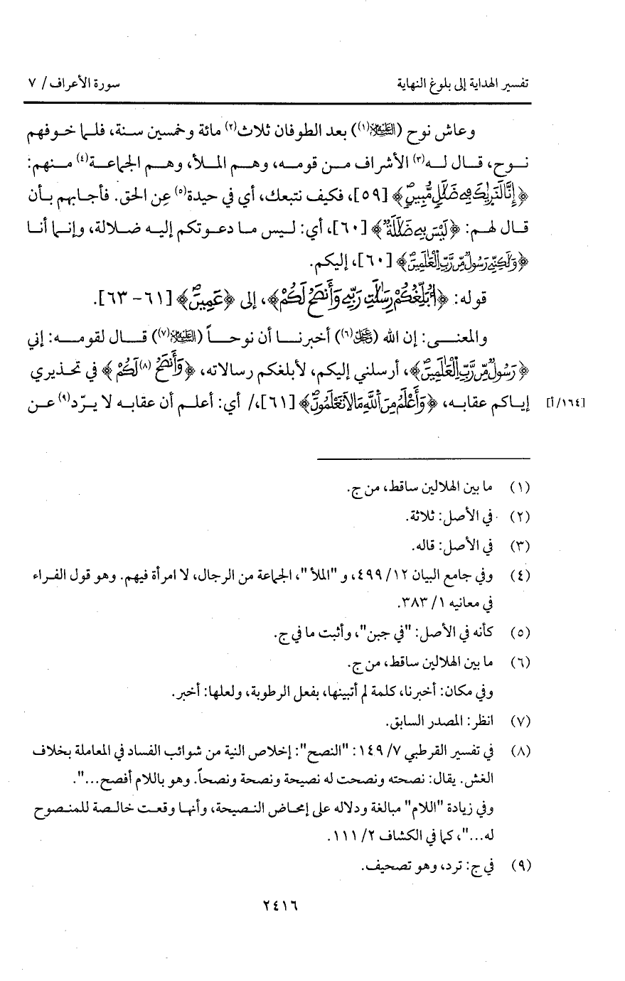 وعاش نوح (عليه السلام) بعد الطوفان ثلاث مائة وخمسين سنة، فلما خوفهم نوح، قال له الأشراف من قومه، وهم الملأ، وهم الجماعة منهم: {إِنَّا لَنَرَاكَ فِي ضَلاَلٍ مُّبِينٍ}، فيكف نتبعك، أي في حيدة عِن الحق. فأجابهم بأن قال لهم: {لَيْسَ بِي ضلالة}، أي: ليس ما دعوتكم إليه ضلالة، وإنما أنا {ولكني رَسُولٌ مِّن رَّبِّ العالمين}، إليكم.