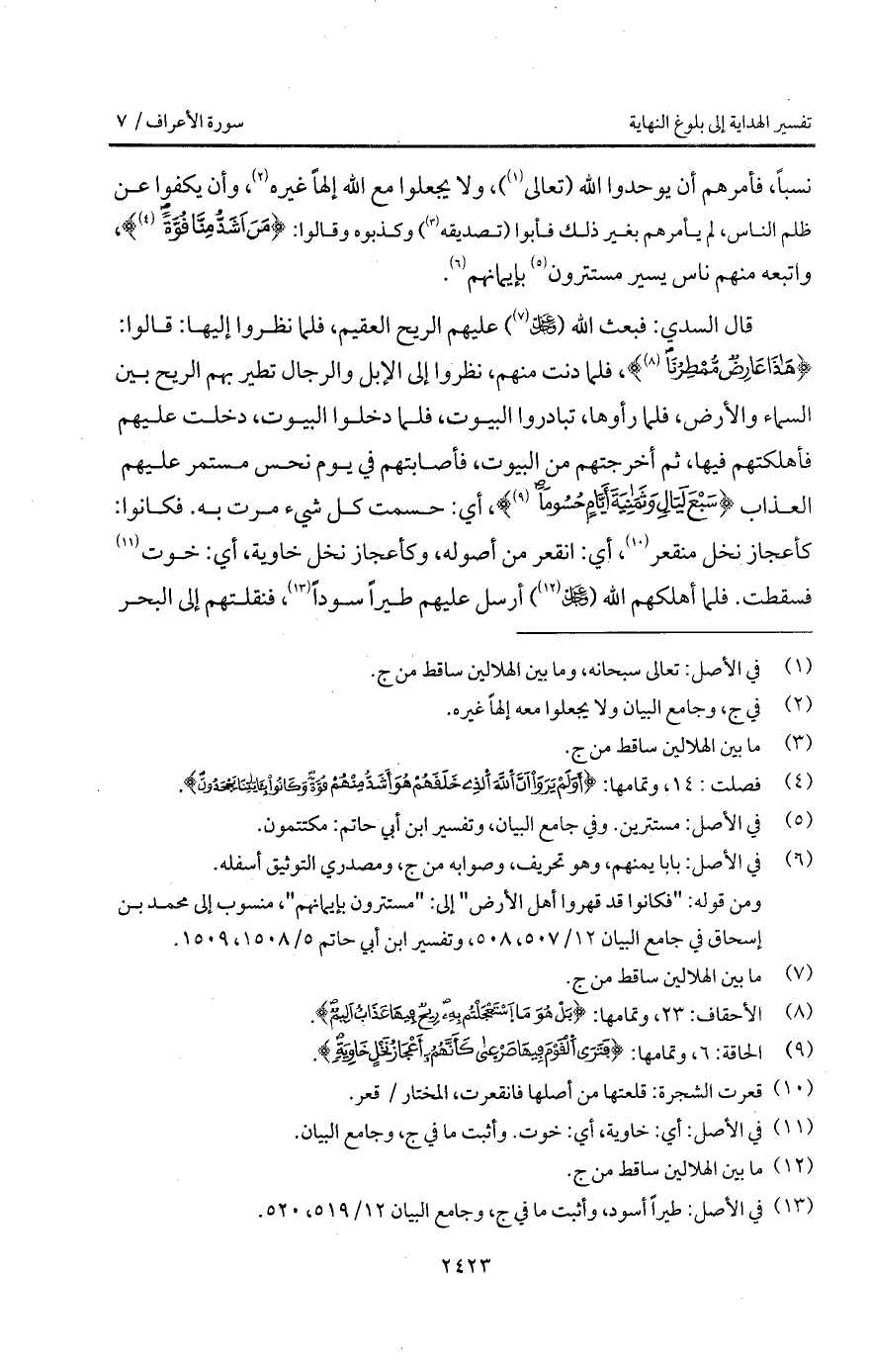 قال السدي: فبعث الله ( D) عليهم الريح العقيم، فلما نظروا إليها: قالوا: {هذا عَارِضٌ مُّمْطِرُنَا} [الأحقاف: 24]، فلما جنت منهم، نظورا إلى الإبل والرجال تطير بهم الريح بين السماء والأرض، فلما رأوها، تبادروا البيوت، فلما دخلوا البيوت، دخلت عليهم فأهلكتهم فيها، ثم أخرجتمهم من البيوت، فأصابتهم في يوم نحس مستمر عليهم العذاب {سَبْعَ لَيَالٍ وَثَمَانِيَةَ أَيَّامٍ حُسُوماً} [الحاقة: 7]، أي: حسمت كل شيء مرت به. فكانوا: كأعجاز نخل منقعر، أي: انقعر من أصوله، وكأعجاز نخل خاوية، أي: خوت فسقطت، فلما أهلكهم الله ( D) أرسل عليهم طيراً سوداً، فنقلتهم إلى البحر