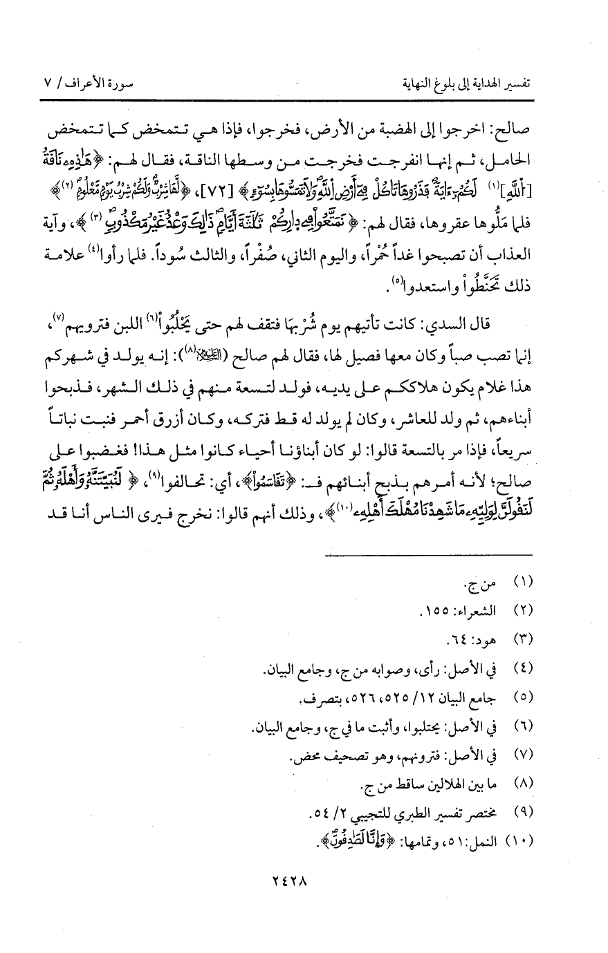 صالح: اخرجوا إلى الهضبة من الأرض، فخرجوا، فإذا هي تتمخض كما تتمخض الحامل، ثم إنها انفجرت فخرجت من وسطها الناقة، فقال لهم: {هذه نَاقَةُ [الله] لَكُمْ آيَةً فَذَرُوهَا تَأْكُلْ في أَرْضِ الله وَلاَ تَمَسُّوهَا بسواء}، {لَّهَا شِرْبٌ وَلَكُمْ شِرْبُ يَوْمٍ مَّعْلُومٍ} [الشعراء: 155] فلما مَلُّوها عقروها، فقال لهم: {تَمَتَّعُواْ فِي دَارِكُمْ ثَلاَثَةَ أَيَّامٍ ذلك وَعْدٌ غَيْرُ مَكْذُوبٍ} [هود: 65]، وآية العذاب أن تصبحوا غداً حُمْراً، واليوم الثاني، صُفْراً، والثالث سُوداً. فلما رأوا علامة ذلك تَحَنَّطُواْ واستعدوا.